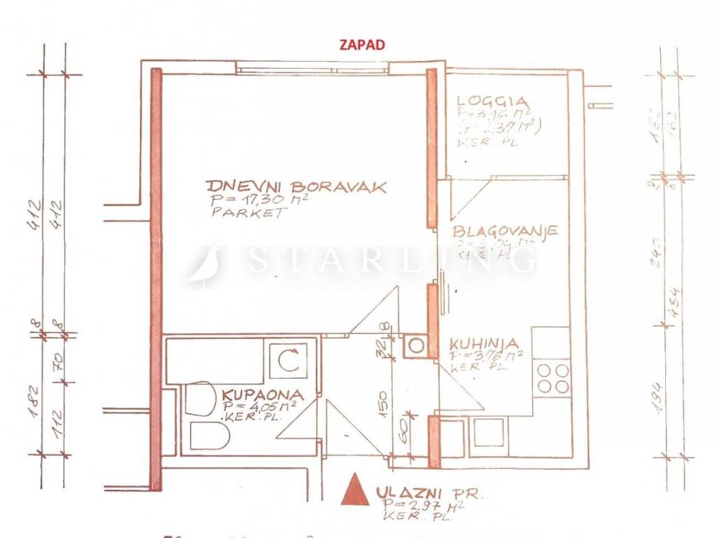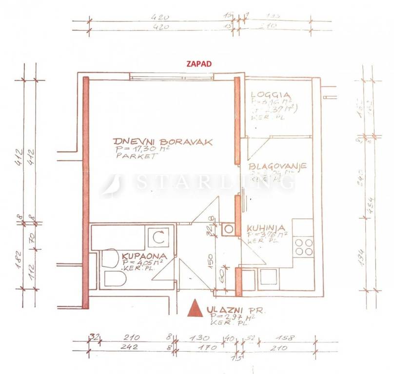 Stan se sastoji od dnevnog boravka/sobe, kuhinje s blagovaonicom, kupaonice s wc-om, ulaznog hodnika i lođe.
