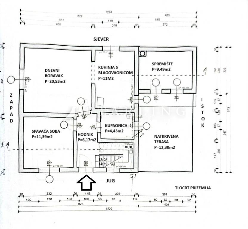 Prizemlje se sastoji od dnevnog boravka, kuhinje s blagovaonicom, spavaće sobe, kupaonice, ostave, spremišta i natkrivene terase, ukupne korisne površine 80 m2.