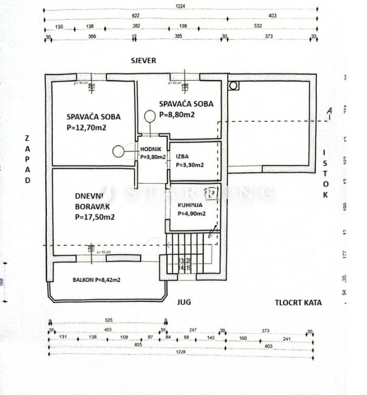 Prvi kat se sastoji od dnevnog boravka, kuhinje, 2 spavaće sobe, prostorije koja se može prenamijeniti u kupaonicu i balkona, ukupne korisne površine 59 m2.
