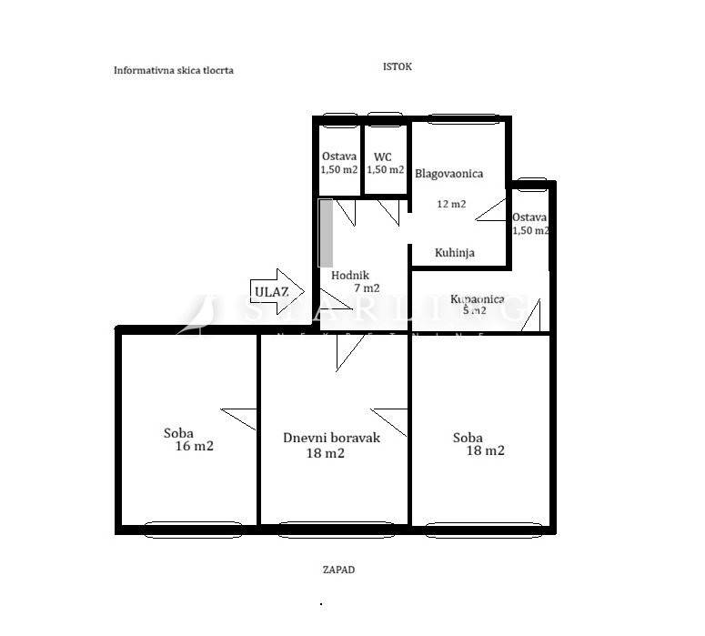 Stan se sastoji od dnevnog boravka, kuhinje s blagovaonicom, dvije spavaće sobe, kupaonice s WC-om, toaleta, hodnika, i dvije ostave.