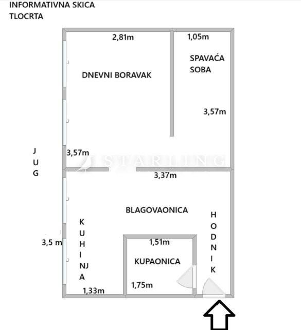 Sastoji se od dnevnog boravka, kuhinje s blagovaonicom, spavaće sobe, kupaonice i hodnika.