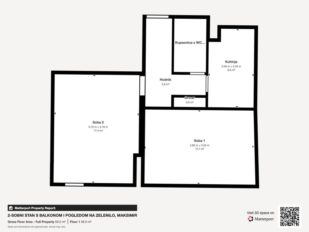 Stan se prostire na 60 m2 stambene površine, a sastoji od dnevnog boravka, odvojene kuhinje, jedne spavaće sobe, kupaonice s WC-om, ulaznog hodnika, te balkona/loggie. Oko zgrade postoji javni naplatni parking, 2. zona.
