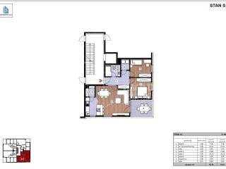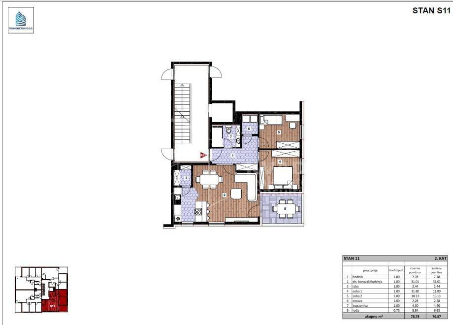 Ukupna stvarna površina stana iznosi 78,78 m2, dok obračunska površina iznosi 76,57 m2.