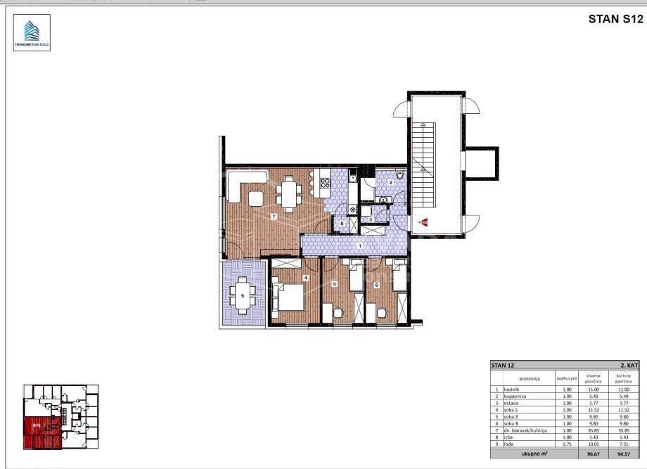 Ukupna stvarna površina stana iznosi 96,57 m2, dok obračunska površina iznosi 94,17 m2.