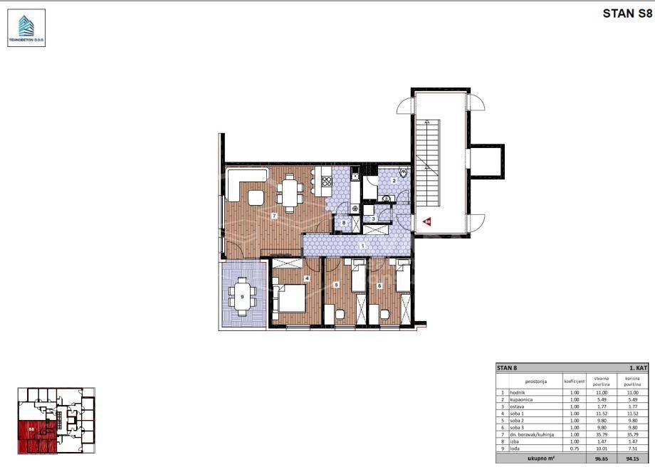 Ukupna stvarna površina stana iznosi 96,65 m2, dok obračunska površina iznosi 94,15 m2.