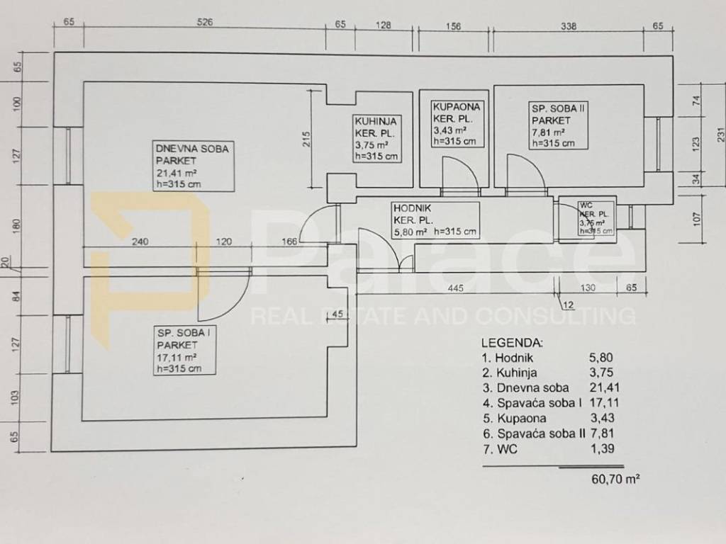 Prostor je funkcionalno raspoređen i sastoji se od prostranog dnevnog boravka povezanog s kuhinjom, dvije udobne spavaće sobe, kupaonice bez WC-a te odvojenog WC-a.