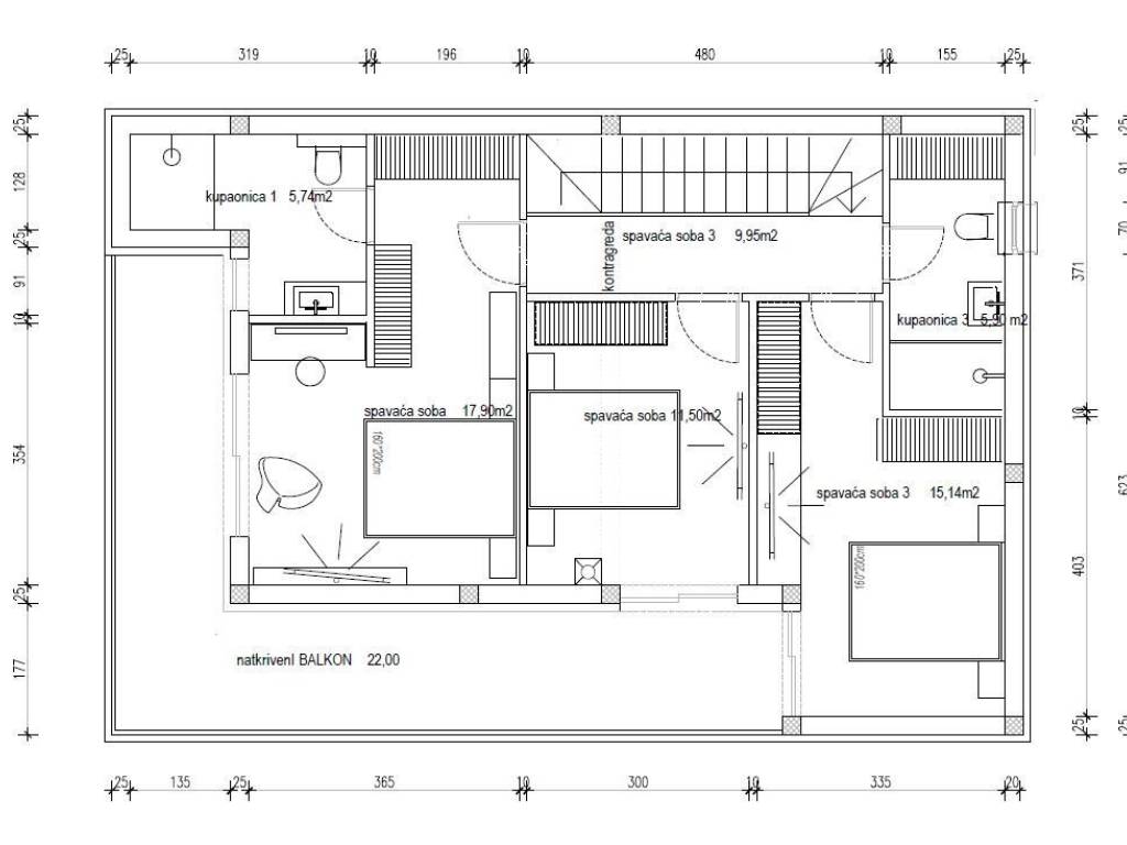 U prizemlju su praktično smještene ostava i vešeraj, a stepenice vas vode na kat vile. Na katu se nalaze tri spavaće sobe te dvije kupaonice. Glavna spavaća soba ima i vlastitu kupaonicu. Iz dvije spavaće sobe imate izlaz na natkriveni balkon površine 22 m2.