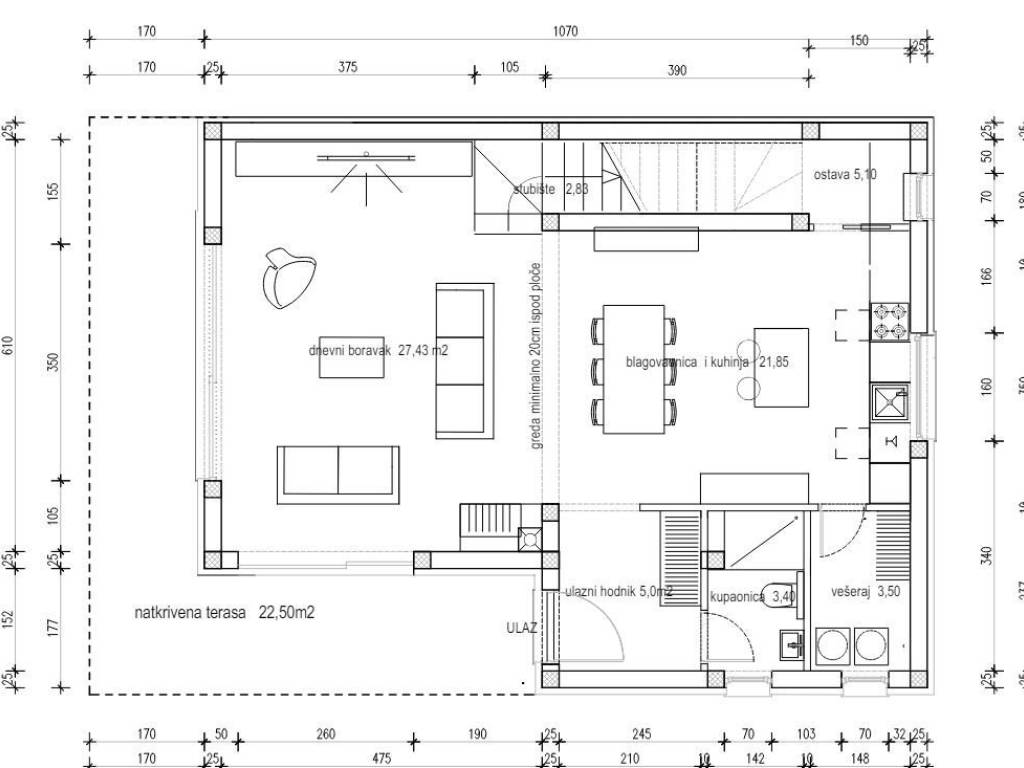 U prizemlju se nalazi open space kuhinja, blagovaonica i dnevni boravak iz kojeg direktno izlazite na natkrivenu terasu površine 22,5 m2.