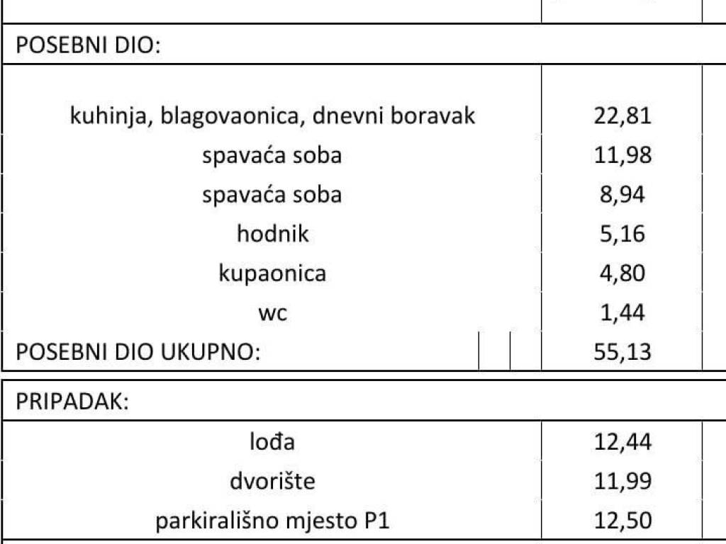 Sa svojih 55,13 m2 površine, ovaj stan raspolaže s dvije spavaće sobe, kupaonicom, wc-om, kuhinjom, blagovaonicom i dnevnim boravkom. Iz dnevnog boravka se izlazi na lođu površine 13 m2, a stan također ima i malo dvorište površine 12 m2.