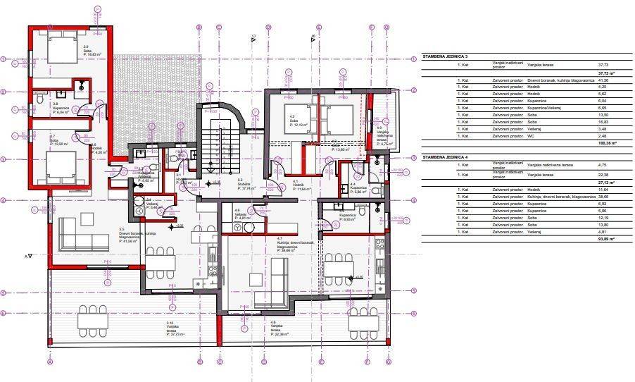 Prostrani dvosobni stan, ukupne korisne površine 93,89 m2.
