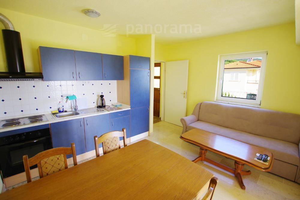 Na prvom katu kuće nalaze se 3 apartmana. Jedan apartman je površine 55 m2. Sastoji se od kuhinje s blagovonom i dnevnim boravkom, te dvije spavaće sobe i kupaonom. Osim balkona s otvorenim pogledom na more, tu je i velika terasa ispred vrata apartmana. Drugi apartman na ovom katu površine je 60 m2 s dodatnih 15 m2 natkrivene balkona s pogledom na more i dodatne terase ukrašene kamenim stolom. Apartman se sastoji od kuhinje s blagovaonom i dnevnim boravkom te jedne spavaće sobe i kupaone. Treći apartman na ovom katu površine je 55 m2, ukupno 100 m2 s balkonom i dodatnom terasom. Sastoji se od kuhinje s blagovaonom i dnevnim boravkom te jedne spavaće sobe i kupaone.