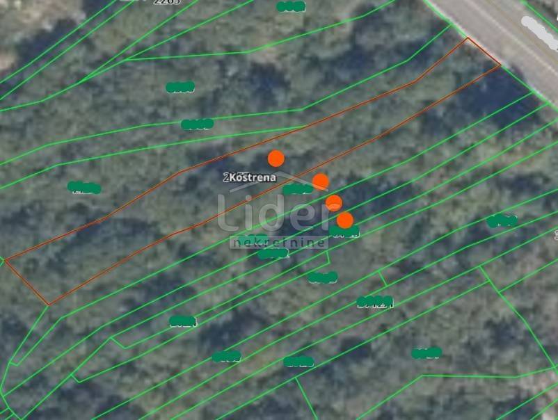 KOSTRENA - ROŽMANIĆI Vrlo lijepo zemljište od 1651 m2, blago nakošeno, pravokutnog oblika, dimenzija 19 x 87 m. Prilaz s glavne, asfaltirane ceste na kojoj se nalaze svi priključci. Izuzetno mirna lokacija, vrlo dobro povezana s glavnim prometnicama. Zemljište je udaljeno 600 m od mora na koje će se nakon čišćenja postojećeg zelenila pružati besprijekoran pogled. Minimalna površina zemljišta za gradnju samostojećeg objekta je 800 m2. Mogućnost gradnje dvije stambene jedinice u jednom objektu te dvojnog objekta.