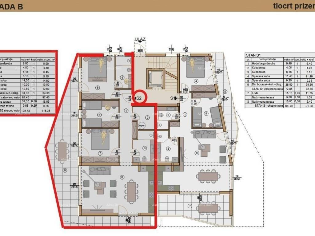 Novi luksuzni projekt, Pješana uvala!Projekt u izgradnji se sastoji od dvije zgrade, svaka ima tri etaže i na svakoj etaži 2 stana. Stan S2, nalazi se u prizemlju zgrade B, površine 135.73m2 (neto površine 116.35 m2) i sastoji se od: hodnika s garderobom, spremišta, 3 spavaće sobe, 2 kupaone, dnevnog boravka s kuhinjom i blagovaonom te prostrane natkrivene terase, kojoj se pristupa iz svih soba, te s koje se pruža pogled na more.Stanu pripadaju 2 parkirna mjesta koja se obavezno dodatno kupuju.Za dodatne informacije, stojimo na usluzi:Azra+ 385 91 611 5706+385 98 420 885azra@almadominvest.com.