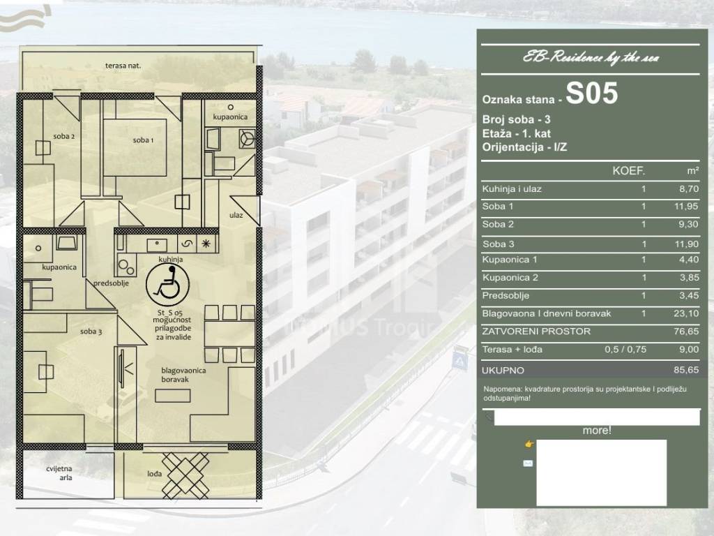 Na prodaju se stavlja stan oznake S05, smješten na 1. katu stambene zgrade u izgradnji. Stan se sastoji od ulaza i kuhinje, predsoblja, blagovaonice i dnevnog boravka, tri spavaće sobe, dvije kupaonice, lođe i terase. Ukupna obračunska površina stana iznosi 85,65 m, od čega 76,65 m čini zatvoreni stambeni prostor, dok terasa i lođa ukupne površine 9,00 m ulaze u obračun prema koeficijentu. Stan je orijentiran na istok i zapad.