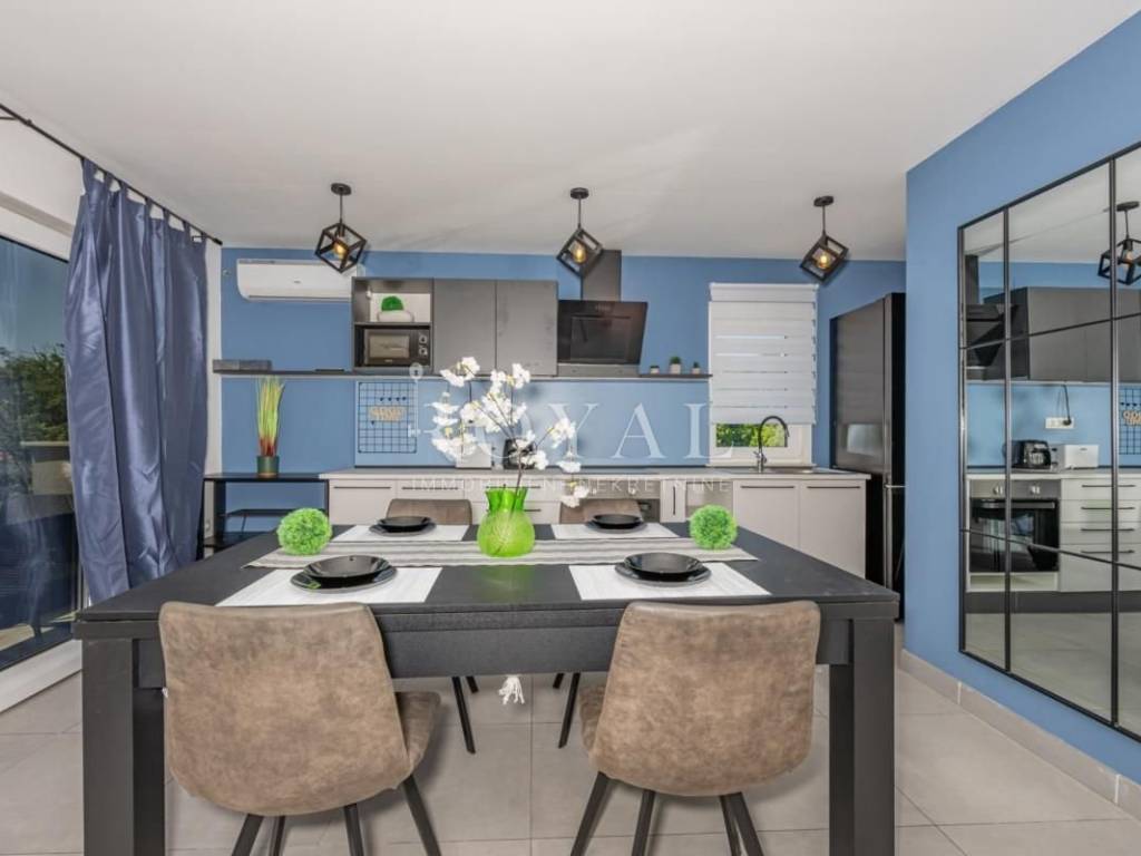 U mirnom i atraktivnom dijelu Kastva iznajmljuje se luksuzno uređen dvoetažni stan površine 90 m². Ova nekretnina predstavlja spoj vrhunske opremljenosti i pažljivo osmišljenog dizajna, prilagođenog suvremenom stilu života. Donja etaža obuhvaća prostranu kuhinju s blagovaonicom te elegantan dnevni boravak koji odiše udobnošću. Na gornjoj etaži smještene su dvije komforne spavaće sobe i luksuzno uređena kupaonica, dok balkon pruža intiman prostor za opuštanje na svježem zraku.