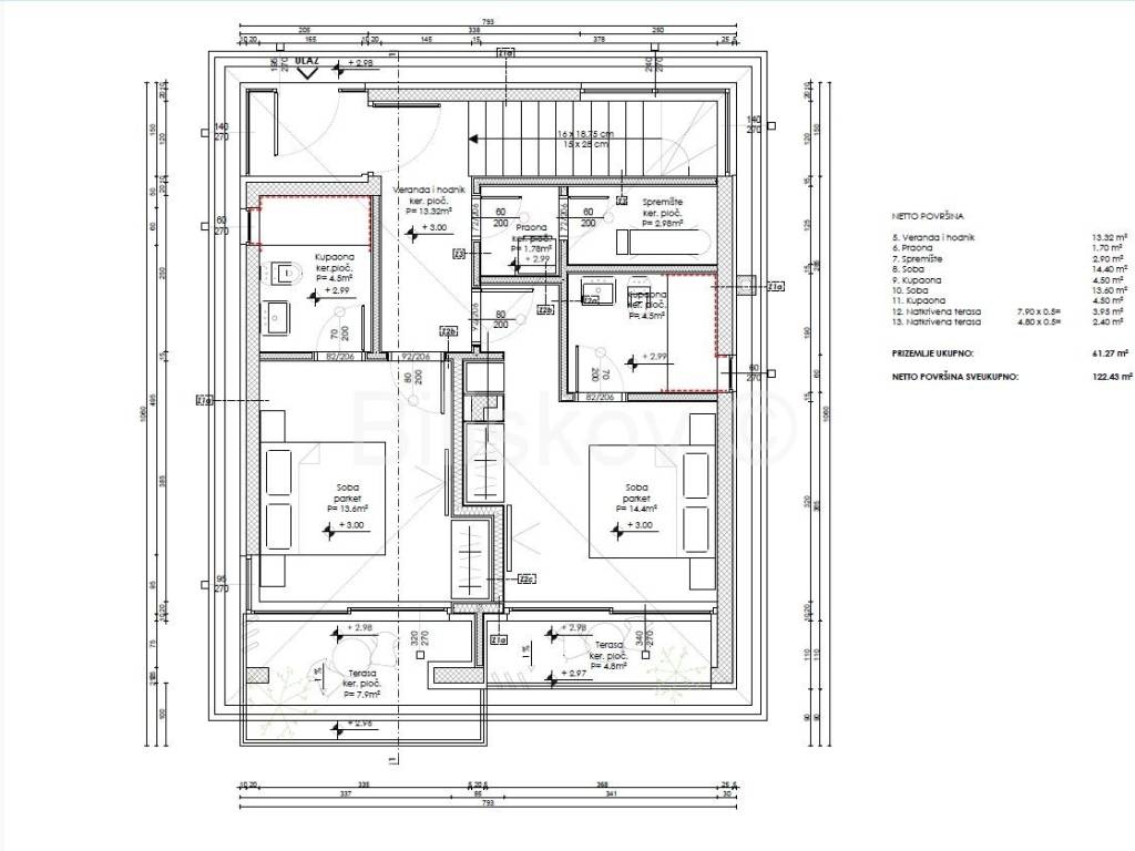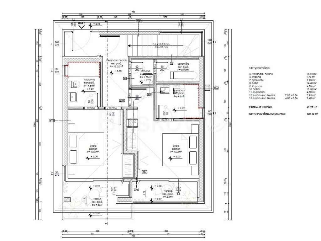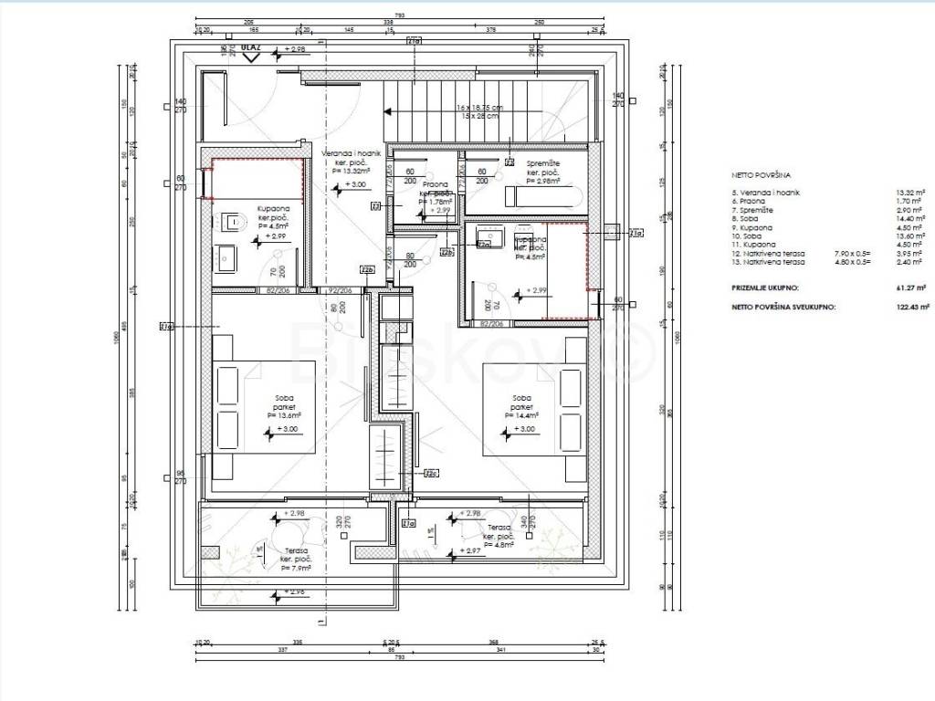 1.kat: veranda I hodnik 13,32m2,2 spavaće sobe svaka cca 14m2 s vlastitom kupaonicom I natrivenom terasom+praona 1,78m2 i sprema 2,98m