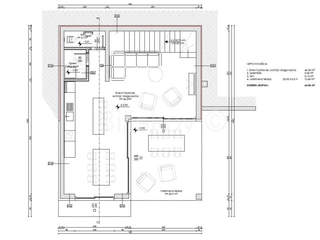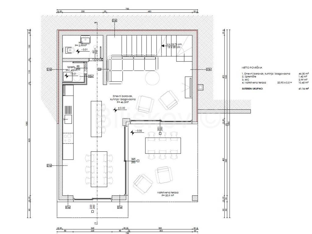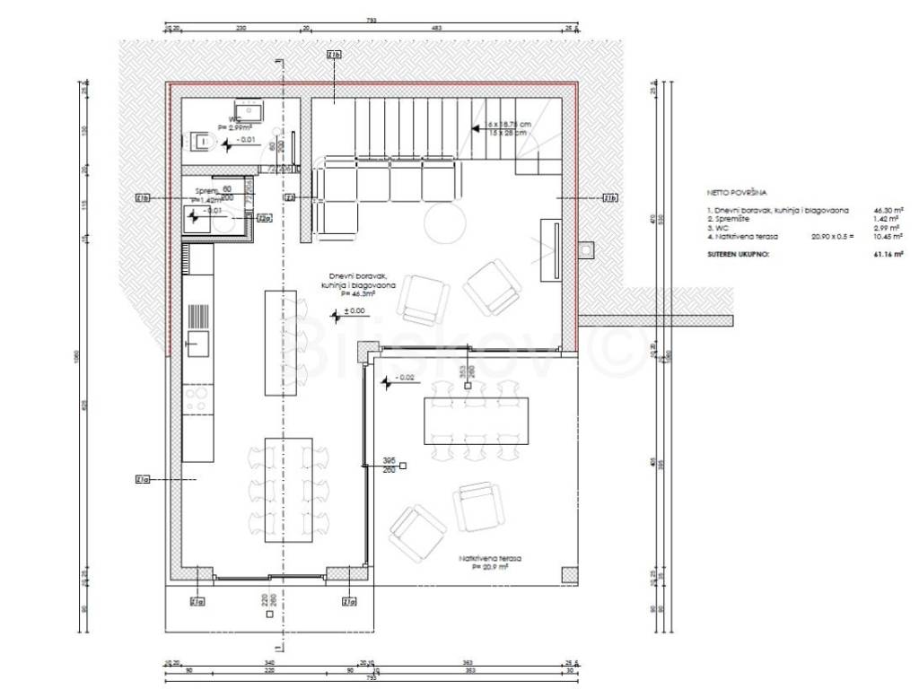 Prizemlje: natkrivena terasa 20,9m2, kuhinja s dnevnim boravkom 46,3m2, wc I sprema.