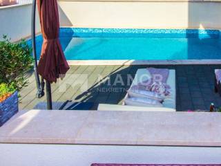 Dnevni boravak ima izlaz na na terasu i okućnicu površine 81 m na kojoj se nalazi grijani bazen sa sunčalištem i roštilj.