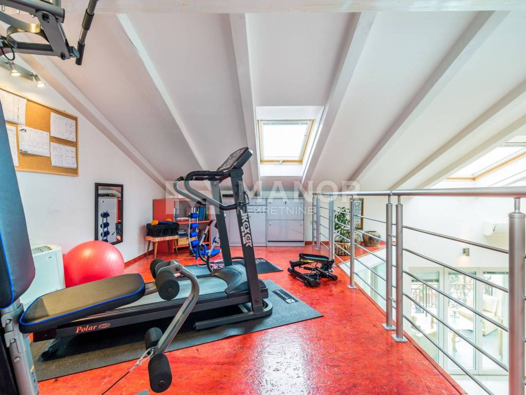 Na gornjoj etaži, pored spavaće sobe, nalazi i galerija s TV-om, fitnesom i dodatnim ležajem za 2 osobe