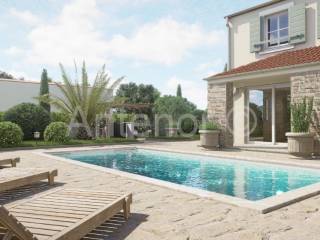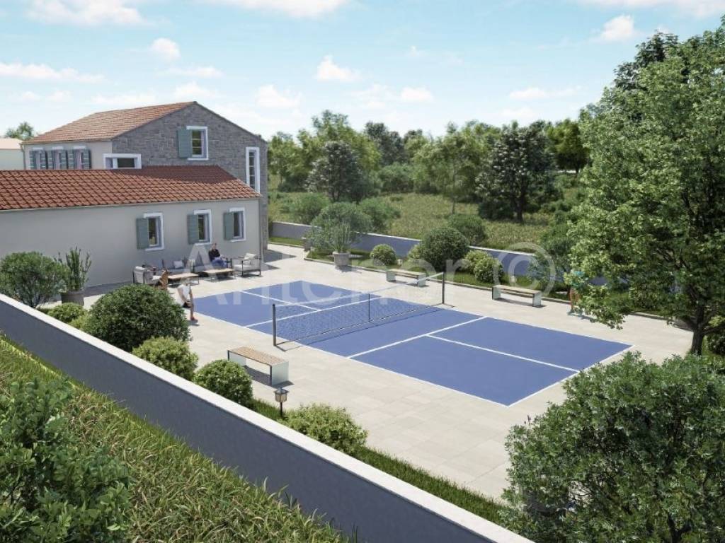 U prizemlju se nalazi prostrani dnevni boravak, kuhinja, sauna, spavaća soba, dvije kupaonice, jedan wc, velika natkrivena terasa sa roštiljem i vanjskom kuhinjom. Na katu se nalaze tri sobe, dvije kupaonice, garderoba i hodnik.