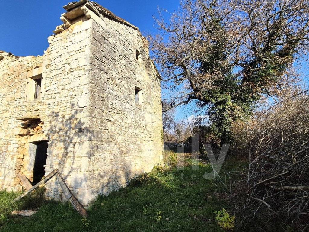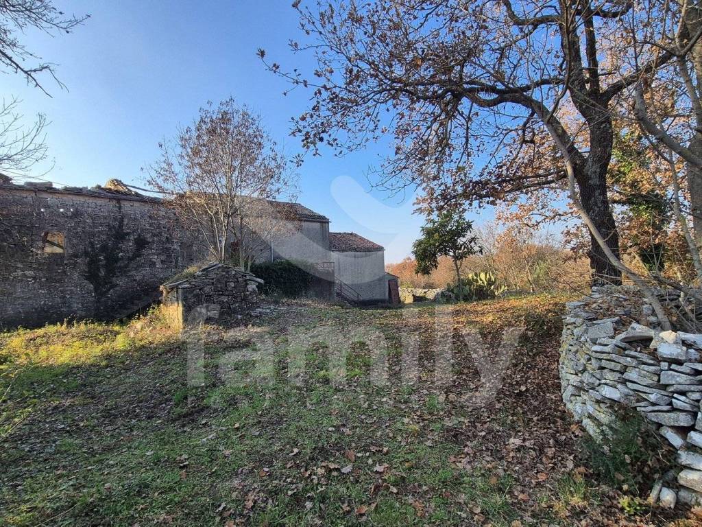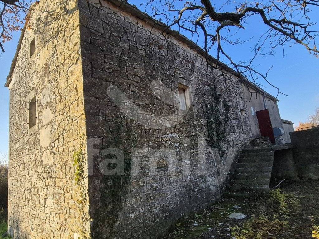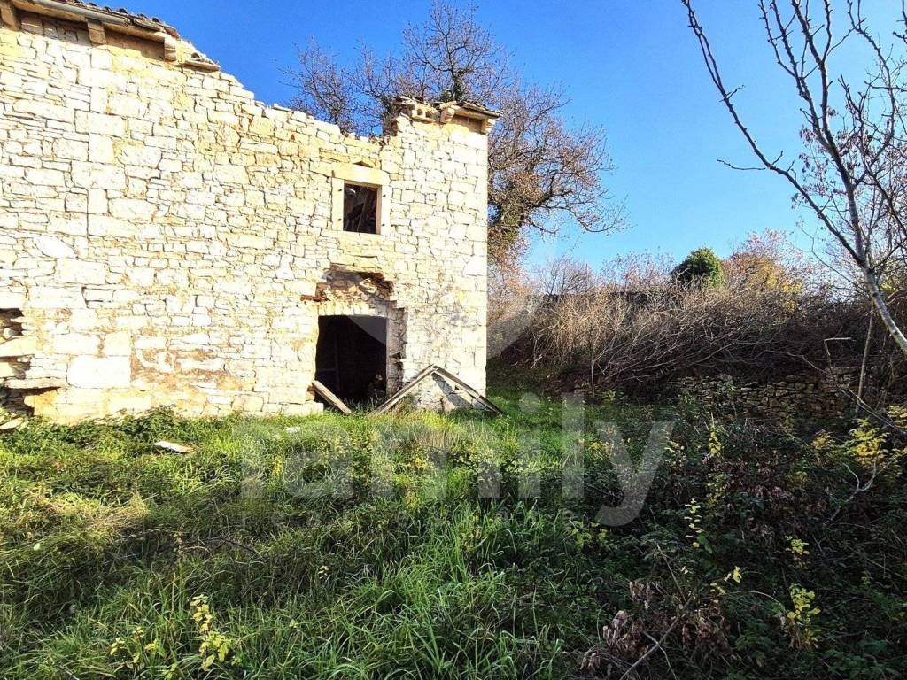 Na prodaju je dvojna kuća za renovaciju smještena na iznimno prostranom zemljištu, na lokaciji koja pruža potpunu privatnost, tišinu i pogled na imanje sveukupne površine 36 074 m2. Nekretnina se nalazi svega 30-tak metara od asfaltirane ceste, s osiguranim pristupnim putem, a istovremeno je dovoljno udaljena od svakodnevnih gužvi. Na zemljištu ima niskih stabala hrasta, ostalo je pašnjak i vinograd. Zemljište je raznoliko i vrlo atraktivno: jedan dio je ograđen tradicionalnim suhozidom, dio je potpuno ravan i idealan za vrt, bazen ili rekreacijski prostor, dok cijelo zemljište odiše autentičnim istarskim karakterom i prirodnim okruženjem. Na samom zemljištu nalazi se dvojna kamena kuća kojoj je sveukupna površina 435 m2 raspoređeno na prizemlje, kat i potkrovlje. Kuća raspolaže s visokim potencijalom za uređenje za stanovanje ili u ugostiteljske svrhe. Na katu se trenutno nalaze soba, kuhinja i manji dnevni prostor s grijanjem na drva, dok je kupaonica odvojena. Drugi dio objekta ima zaseban ulaz i danas služi kao garažni prostor i spremište, s mogućnošću prenamjene u dodatne stambene ili turističke sadržaje. Druga polovica kuće je skroz u kamenu s tim da je porušena. Ispred kuće nalazi se urbanizirani dio zemljišta pogodan za gradnju dodatnih objekata na svega 3602 m2. Zemljište je pozicionirano sa blagim nagibom tako da posjeduje otvoreni pogled, a sa prizemlja se djelomično vidi i more. Okvirno 20 metara udaljeno od kuće nalazi se drugi objekt koji je djelomično postojan u kamenu koji je korišten kao štala sveukupne površine 90 m2. Ispred nekretnina posjedujemo i kažun sveukupne površine okvirno 10 m2. Zbog velikog broja suhozida postoji velika količina kamenja za ograditi česticu. Na zemljištu se nalazi i cisterna za vodu. Jedan od dva objekta posjeduje uporabnu dozvolu.