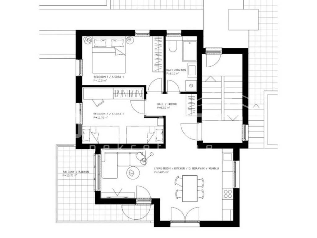 Na prestižnoj lokaciji u samom srcu Komiže u prodaji je stan u izgradnji površine 65 m2, smješten na drugom katu moderne urbane vile, s otvorenim pogledom na prirodu i crkvu svetog Nikole. Stan je osmišljen kao elegantan i funkcionalan životni prostor koji objedinjuje suvremeni dizajn i bezvremenski mediteranski karakter. Stan se sastojoi od dvije spavaće sobe, kupaonice te prostranog open space dnevnog boravaka s kuhinjom i blagovaonicom. Prodaje se u visokoj roh-bau završnoj fazi, s potpuno ugrađenim sanitarnim elementima, kvalitetnim podnim oblogama, postavljenom stolarijom, protuprovalnim ulaznim vratima i svim potrebnim priključcima, dok kuhinja i namještaj nisu uključeni, omogućujući personalizaciju interijera prema najvišim standardima. Gradnja se izvodi korištenjem vrhunskih materijala i suvremenih sustava, uključujući YTONG konstrukciju, kamenom obloženo stubište, PVC stolariju s ALU roletama i griljama, silikatnu završnu obradu pročelja s kamenim detaljima te sustav grijanja i hlađenja putem klima uređaja. Planirani završetak građevinskih radova predviđen je do 1. lipnja 2026. godine, dok su uporabna dozvola i etažiranje planirani tijekom jeseni iste godine.