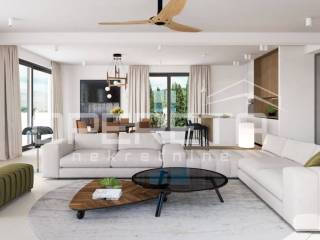 Prozori od poda do stropa povezuju interijer s eksterijerom, otvarajući pogled i pristup terasi koja nudi dodatni prostor za opuštanje ili zabavu.