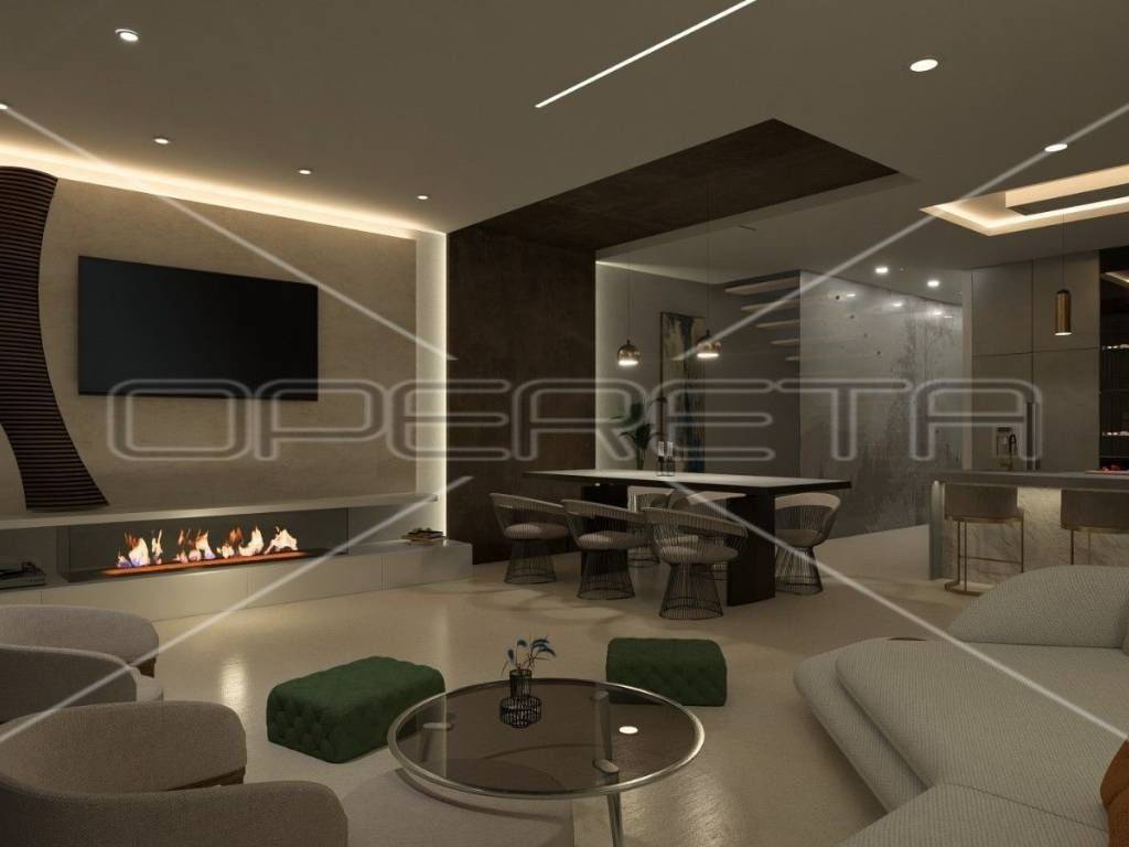 U prizemlju ove moderne vile se nalazi prostrani dnevni boravak s predivnim pogledom na more i grad, koji je povezan s kuhinjom, blagavaonicom i velikom terasom kao i spavaća soba i kupaonica.