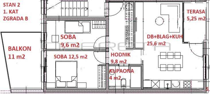 Manja zgrada sa samo 4 stana. Stan se sastoji od " open space" dnevnog boravka, blagovaonice i kuhinje s izlazom na loggiu, dvije sobe i kupaonice s wc-om. Istočne je i zapadne orijentacije. U cijeni je garaža, vanjsko parkirno mjesto i spremište od 7,5m2. Odlična lokacija na par minuta pješaćke udaljenosti od osnovne škole, trgovine i autobusne stanice, kao i do svih ostali sadržaja važnih za ugodan život. Useljenje 11/2026.