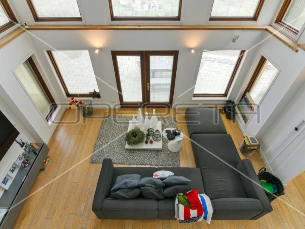 U PRIZEMLJU ( 145m2) nalazi se veliki open space- s boravkom, blagovaonicom i kuhinjom, okruženi velikim prozorima i vratima, s izlazom na terasu od 200 m2, s pogledom na obronke i Zagreb, te brojne gospodarske prostorije.