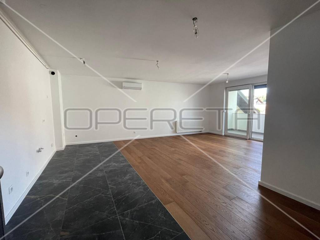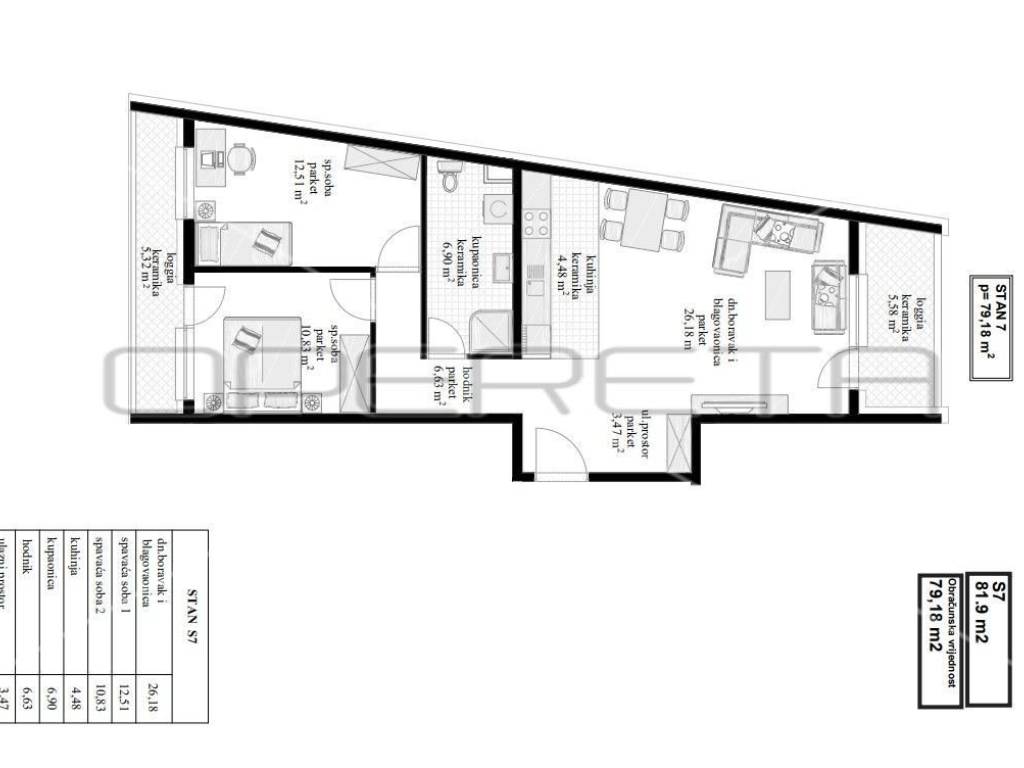Stan se sastoji od open space boravak/kuhinja, dvije spavaće sobe, kupaona, dvije loggie. Obavezna kupnje garažno-parnirnog mjesta. (20000 eura)