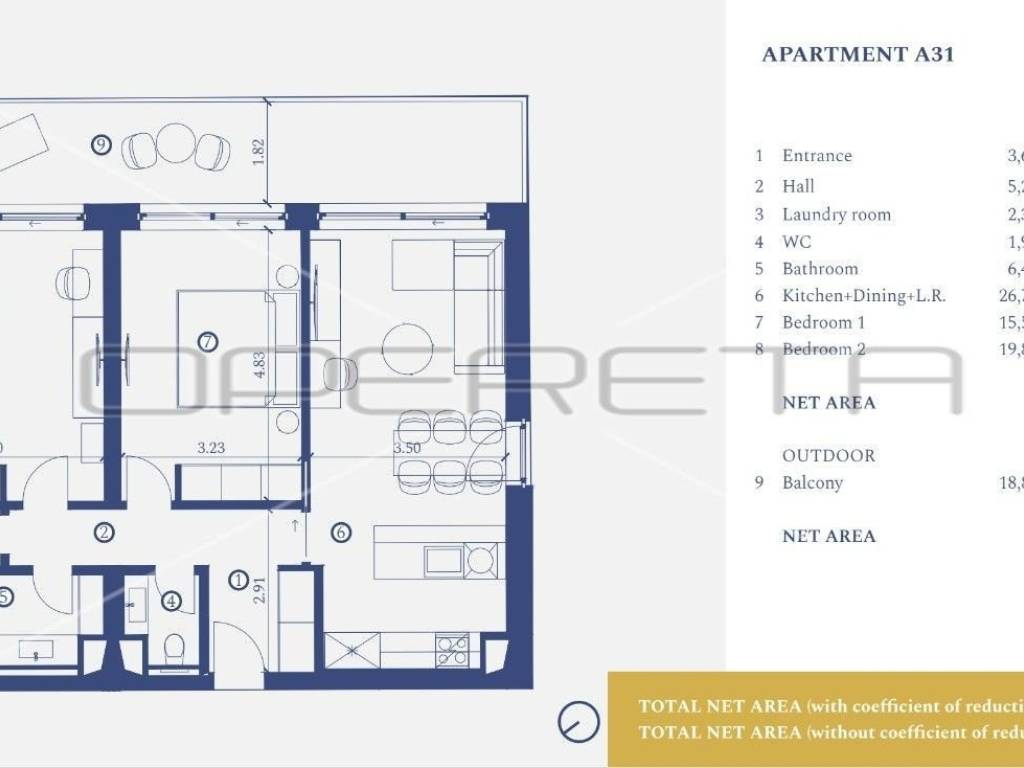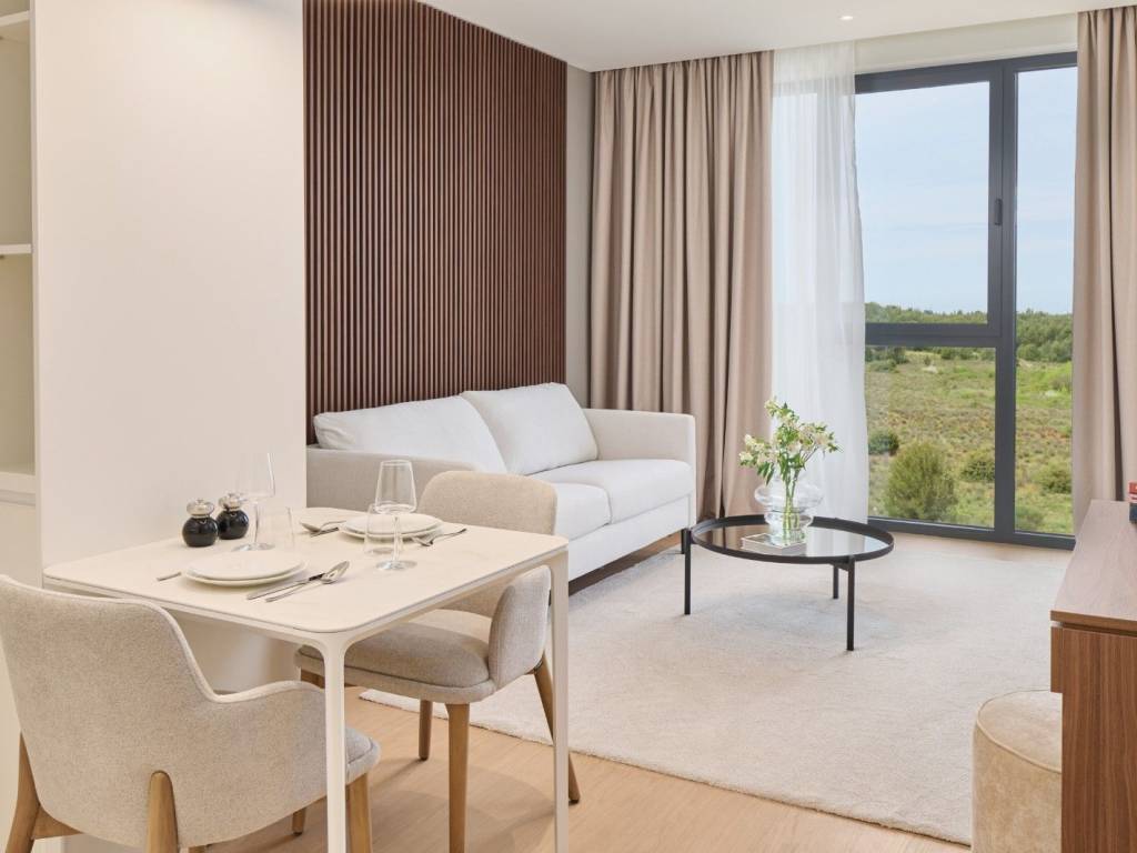 Manje od 200m udaljenosti od plaže unutar luksuznog resorta koji zadivljuje 100-metarskim bazenom na krovu aparthotela. Dizajnerski namještaj, pogled na more, blizina golf igrališta, spa centar, restorani, trgovine, bazeni unutar resorta, concierge usluga, itd. čine ovaj apartman neodoljivim. Jedinica A31 se nalazi na 2. katu, ukupne je neto površine 100,20 m2. Sastoji se od ulaza, hodnika, vešeraja, 2 kupaonice, WC-a, 2 spavaće sobe i open space dnevnog boravka sa kuhinjom i blagovaonicom. Također, ima i balkon površine 18,80 m2.