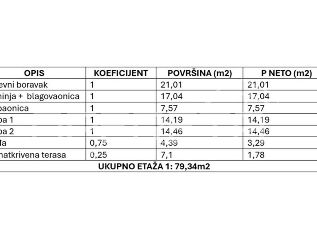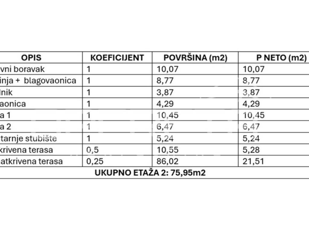 Sastoji se od 2 etaže. Prva etaža se sastoji od kupaonice s toaletom, dvije spavaće sobe, otvorenog koncepta kuhinje, blagovaonice i dnevnog boravka, dok dodatnu vrijednost prostoru daju lođa i nenatkrivena terasa sa koje se pruža otvoreni pogled na more. Unutarnje stubište vodi na drugu etažu koja se prostire na 75,95m2 sa hodnikom, kupaonicom, dnevnim boravkom, kuhinjom I blagovaonicom, 2 spavaće sobe te natkrvenom I nenatkrivenom terasom s koje se pruža pogled na more.