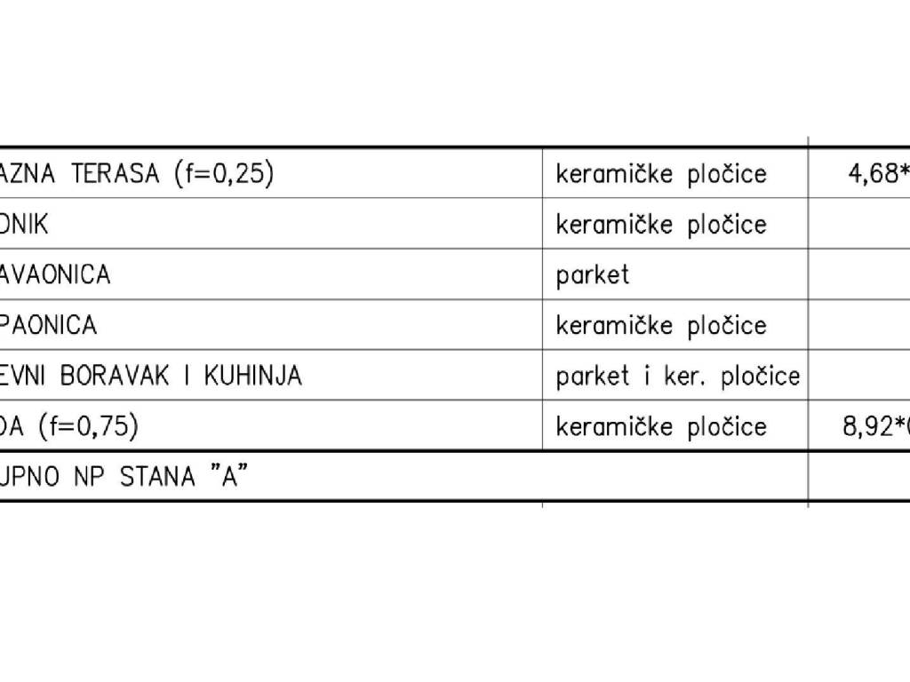 Stambeni dio površine 45.08 m sastoji se od ulaznog prostora, spavaće sobe, dnevnog boravka s kuhinjom i blagovaonicom, kupaonice i terase. SStanu pripadaju dva parkirna mjesta i vrt površine 50 m2.