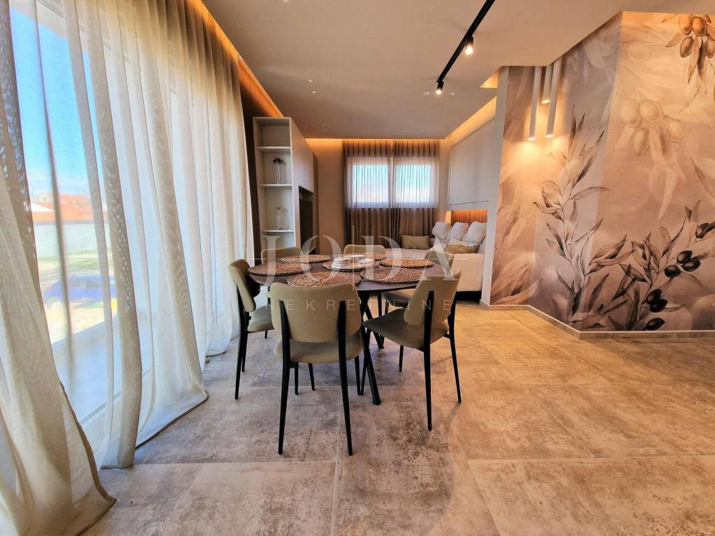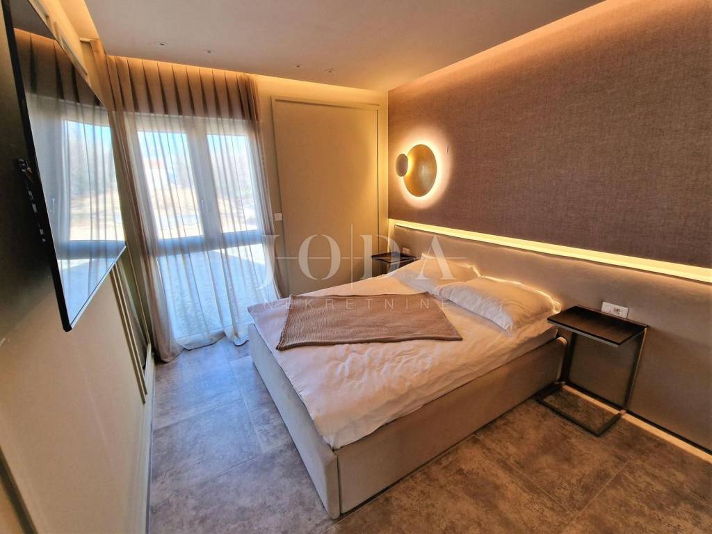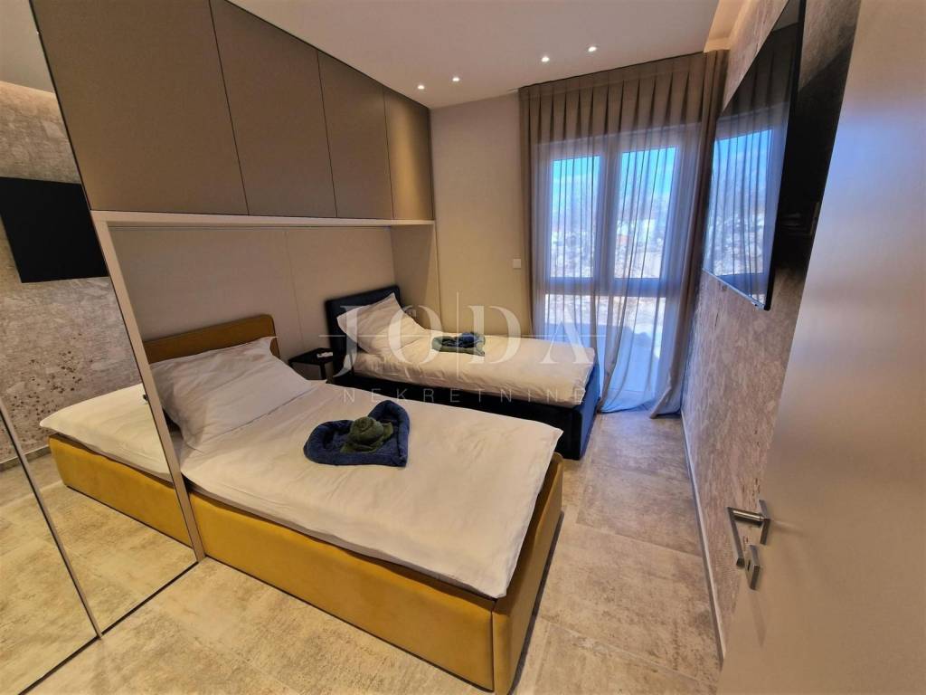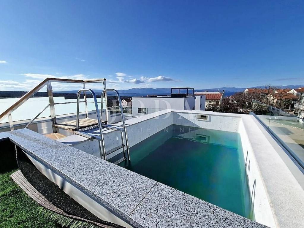 Prodaje se novi, moderno opremljen dvoetažni apartman s bazenom i pogledom na more u Njivicama na otoku Krku!  Apartman je smješten u stambenoj zgradi na odličnoj lokaciji, cca 500 metara od plaže. Ukupna stambena površina apartmana je 112 m2. Raspoređena je na prizemlje, gdje se nalazi spavaća soba, kupaonica i vešeraj te kat gdje je dnevni boravak s kuhinjom i blagovaonicom, balkon, dvije spavaće sobe i još jedna kupaonica. Apartman je kompletno namješten i opremljen - klimatizacija prostorija, podno grijanje, moderne sanitarije i kvalitetne podne obloge. Prodaje se sa svom opremom i namještajem te je spreman za useljenje. S kata se dolazi na  krovnu terasu s prekrasnim pogledom na more, bazenom i sunčalištem. Apartmanu pripadaju i dva parkirna mjesta. Za više informacija, kontaktirajte nas!  ID KOD AGENCIJE: EI-4595  Josip Šikić, mag.oec Agent s licencom Mob: +385 91 890 4694 Tel: +385 51 403 771 E-mail: info@joda-nekretnine.hr www.joda-nekretnine.hr