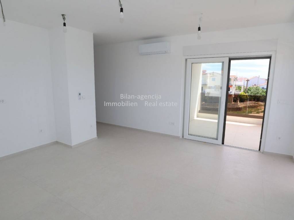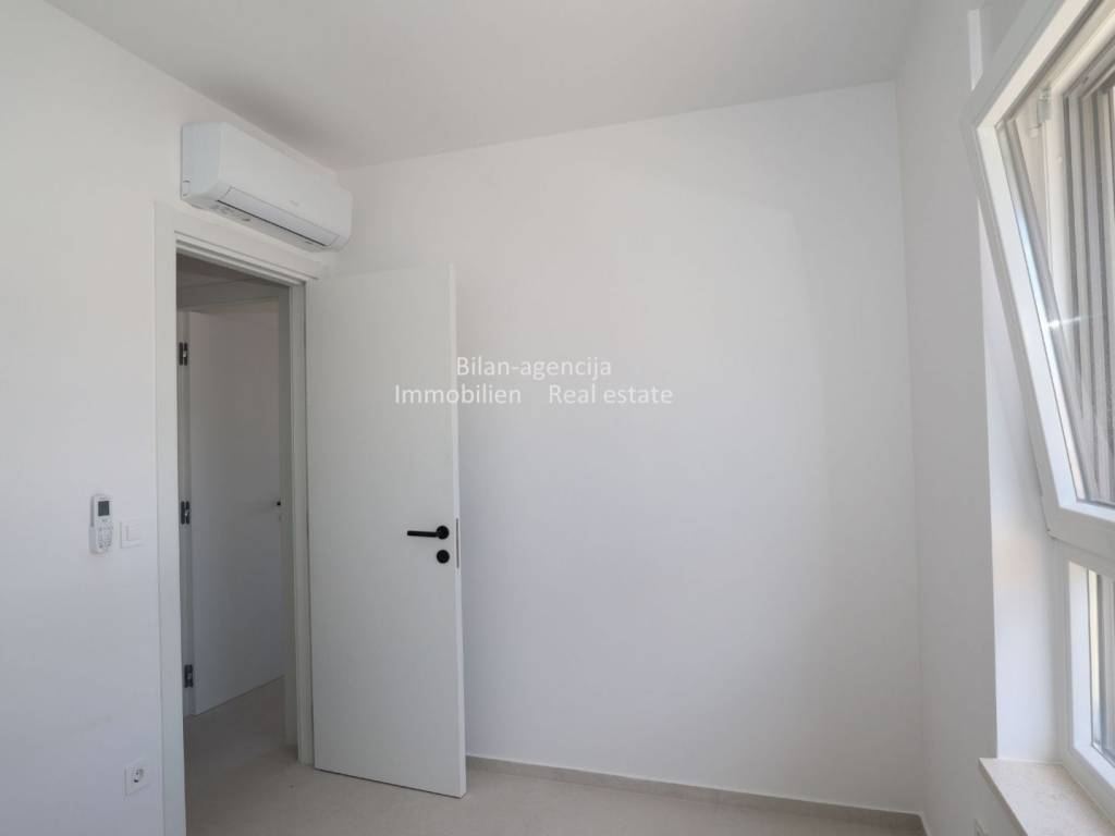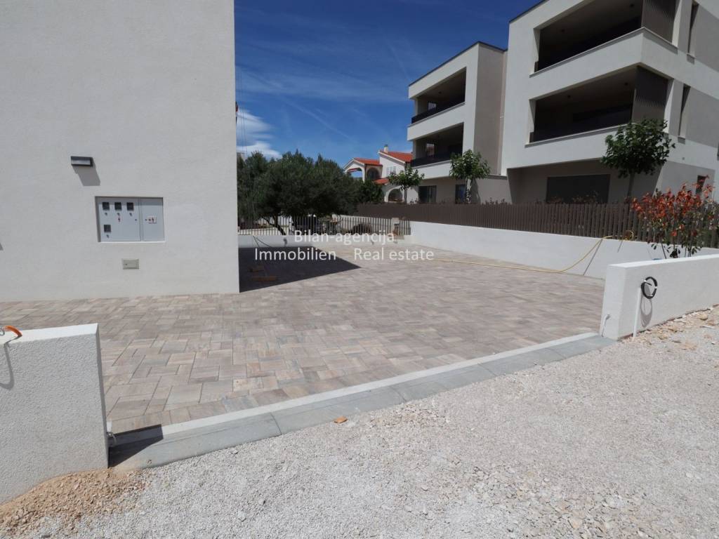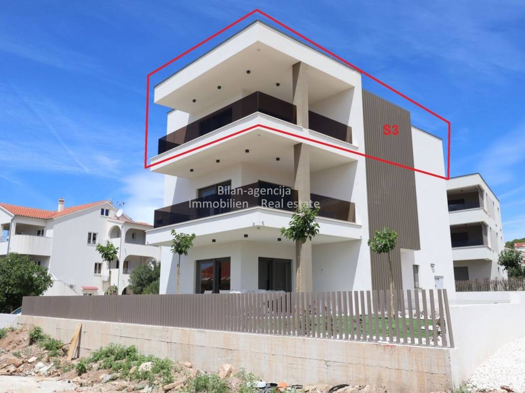 Stan se nalazi u Vodicama, na drugom katu novogradnje. Sastoji se od 3 spavaće sobe, 2 kupaonice, kuhinje-blagovaone-dnevnog boravka, hodnika i terase sa direktnim pogledom na more. Stanu pripada podrumsko spremište površine 9,61 m2 i 2 parkirna mjesta u ograđenom dvorištu.