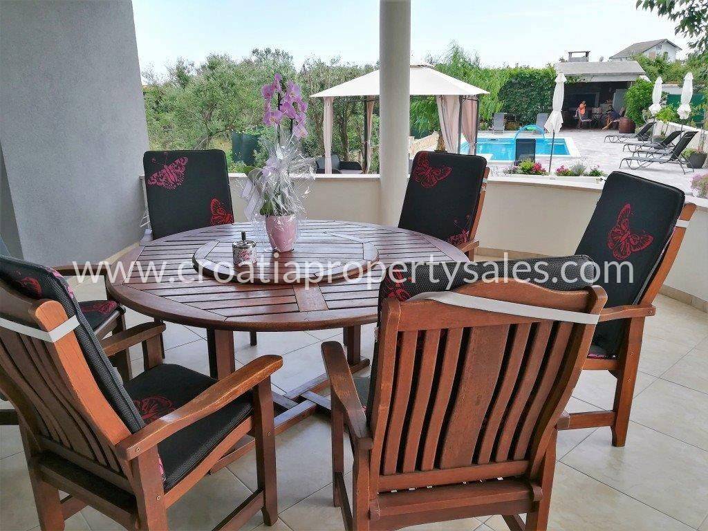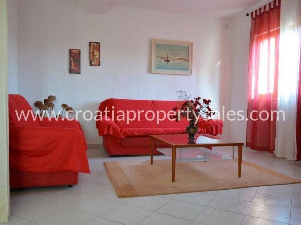 Apartmanska kuća u prvom redu do mora na parceli površine 1100 m2.Kuća je okružena mediteranskim biljem, a u sklopu parcele nalazi se bazen sa sunčalištem i ljetnjom kuhinjom površine 60 m2.Površina kuće je 390 m2.U podrumu kuće nalazi se konoba uređena u dalmatinskom stilu i dodatni studio apartman.Prizemlje kuće čini prostrani dvosobni apartman.Na prvom i drugom katu nalaze se po dva jednosobna apartmana svaki s pripadajućom terasom s koje se pruža prekrasan pogled na more.Krov kuće je velika terasa s provedenim instalacijama za jacuzzi. Pogled na more je spektakularan.Iako u prvom redu do mora, na svega 30 m od lijepe plaže kuća nudi privatnost i mir.Kuća ima svu potrebnu infrastrukturu i nalazi se u neposrednoj blizini svih potrebnih sadržaja.