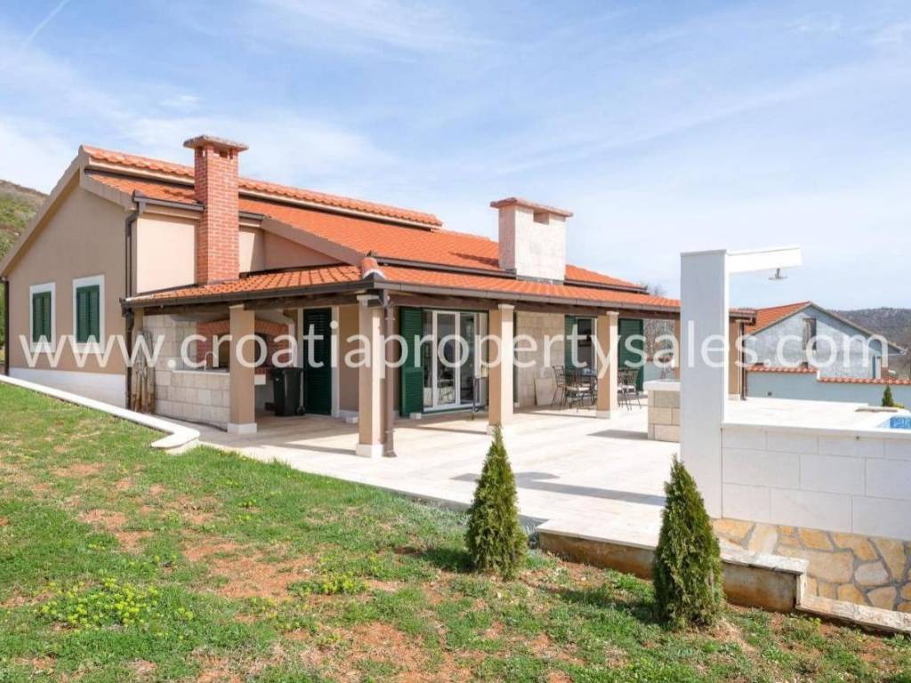 Samostojeća kuća s bazenom s predivnim pogledom na planine.Sagrađena je 2017. g., na zemljištu od 1000 m2.Kuća se sastoji od jedne etaže na kojoj se nalazi prostrani dnevni boravak s blagovaonicom, tri spavaće sobe i kupaonica.Interijer je uređen u neutralnim bojama sa spojem modernog i klasičnog.Mediteransko bilje, održavana okućnica i bazen nude predivan ugođaj za druženja.Idealna je za obiteljska druženja, ali ima i turistički potencijal.Do mora ima nekih 25 minuta vožnje.