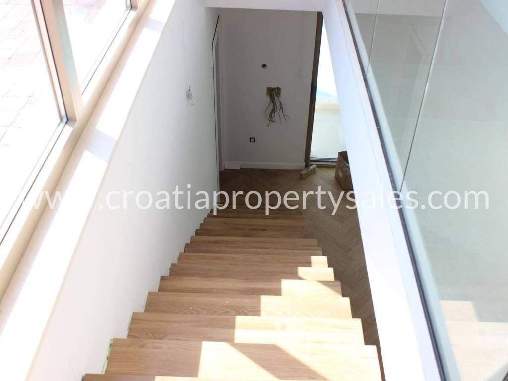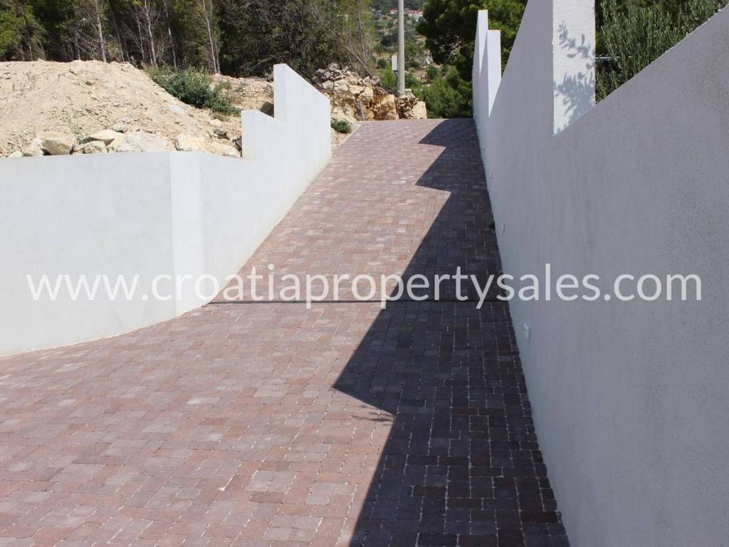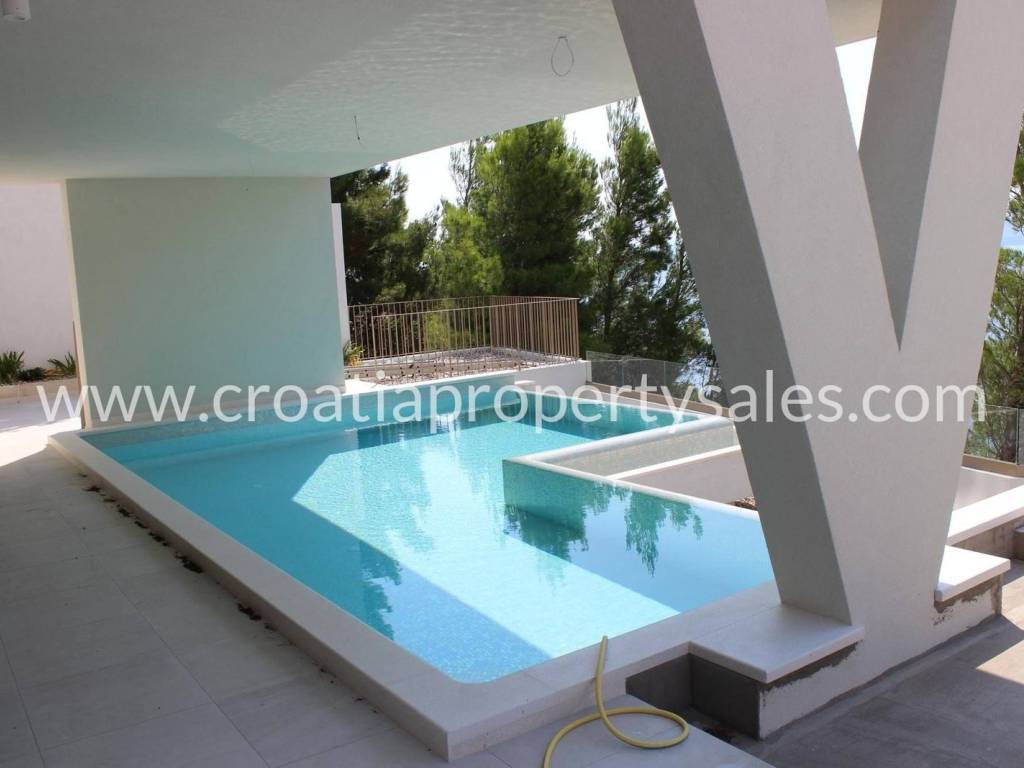 Moderna vila, u prvom redu do mora na povišenoj lokaciji s panoramskim pogledom.Vila se sastoji od tri etaže koje su pomno osmišljene da bi svojim korisnicima pružile maksimalnu udobnost.Na prvoj etaži nalazi se praonica, wc te kuhinja otvorenog koncepta s blagovaonicom i dnevnom sobom.Cijela južna strana dnevnog prostora je stavljena u staklene otvore koji doprinose osjećaju prozračnosti i osvjetljuju prostor. Iz dnevnog dijela se izlazi na veliku terasu sa sunčalištem i dijelom natkrivenim bazenom.Na drugoj etaži nalazi se glavna spavaonica sa garderobom i pripadajućom terasom. Na istoj razini nalazi se garaža za dva automobila.Na zadnjoj etaži nalaze se dvije spavaonice sa pripadajućim kupaonicama.U izgradnju vile investitor namjerava primijeniti visoke standarde gradnje počevši od izolacije, podnog grijanja u kupaonicama, električne rolete, aluminijsku stolariju na prozorima, visokokvalitetne podne obloge…Predviđeni početak gradnje vile je rujan 2023. godine, a zainteresirani kupci za vrijeme gradnje imaju mogućnost izmjene dizajna prema vlastitim željama.