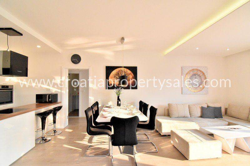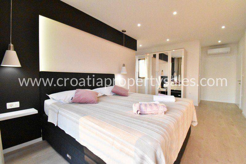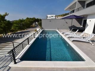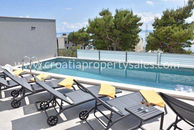 Dvojni objekt modernog dizajna s pogledom na more, na zapadnom dijelu MakarskeObjekt se sastoji od dvije tlocrtno iste kuće s bazenima.Svaka od kuća ima ukupno 157 m2, nalazi se na zemljištu od 275 m2, te ima potpuno  odvojene ulaze, jedan sa istočne, a drugi sa zapadne strane.Svaka od kuća sastoji se od prizemlja i kata. U prizemlju se nalazi vanjska ostava, kuhinja, blagovaonica, te dnevna soba otvorenog koncepta, 1 spavaća soba sa kupaonicom, unutarnja ostava, te igraonica. Iz dnevnog dijela izlazi se na terasu s bazenom i sunčalištem površine 42 m2.Na prvom katu smještene su dvije spavaće sobe sa vlastitim kupaonicama, te južno orijentiranim terasama.Kuće se prodaju sa svim pripadajućim namještajem i opremom.Cijena pojedinačne vile je 750 000 EUR, a oba objekta se prodaju za 1 400 000 EUR.