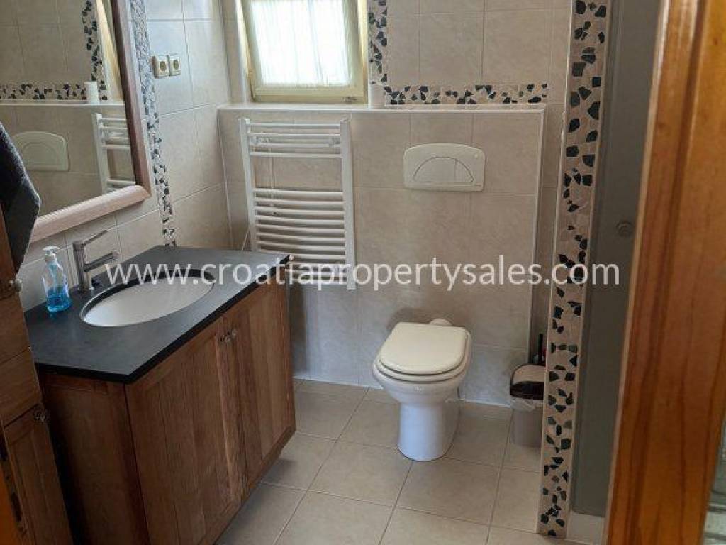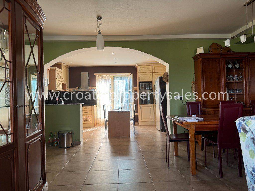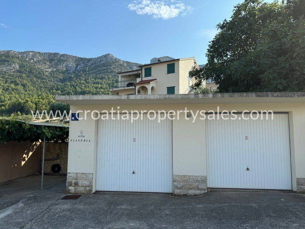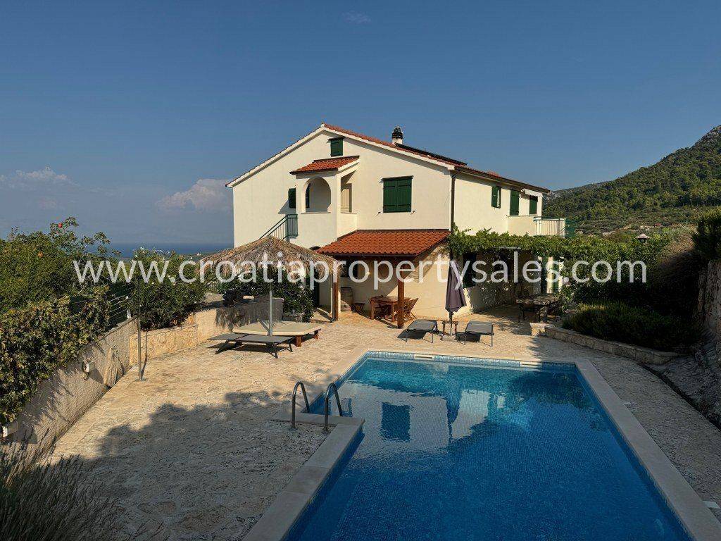 Samostojeća moderna kuća veličine  262 m2 sa pogledom na more i  bazenom od 32m2 je smještena na parceli od 1000 m2 na padinama brežuljka sa prekrasnim otvorenim pogledom na more, maslinike, vinograde polja lavande, Makarske  Riviere i Brač, ima pogled na sve strane oko  nje. Kuća je izgrađena 2004. godine, kvalitetne je gradnje i jako dobro očuvana. Kuća ima direktan pristup autom, dvije garaže od otprilike 45 m2 uz cestu i jedan natkriveni parking.U vrtu oko kuće  i bazena je posađeno mediteransko bilje: mandarine, limun, naranča, nekoliko maslina, lavanda, ružmarin.Odmah do bazena je strojarnica za bazen sa malom konoba za vino.Iza kuće se nalazi  kamin i dvorište  za ispeći meso, ribu i šta još srce poželi.Kuća ima podrum sa spremištem, ostavu, praonicu, i zatvoreni unutrašnji kamin za zabavu!U prizemlje se malazi privatan stan ssa ptvprenim koceptom kuhinje i dnevnog boravja, veliki dnevni boravak, kuhinja, blagovaonica, sprema, kupaonica i dvije spavače sobe, izlaz na terasu.Na katu su dva apartmana, jedan jednosoban i jedan dvosoban.Kuća je smještena na mirnoj lokaciji, te pruža privatnost. Bazen se grije pomoću solarnih panela, bojler od 320 litara se nalazi ispod stepenica. Ova kuća dolazi s dozvolom za iznajmljivanje gornjeg kata.