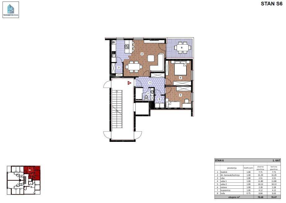 Ukupna stvarna površina stana iznosi 78,68 m2, dok obračunska površina iznosi 76,47 m2.
