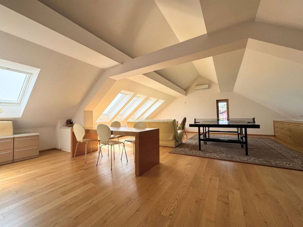 Potkrovlje je uređeno kao otvoreni prostor za zabavu sa ugodnim kutkom za druženje i kuhinjom. Veliki krovni prozori s roletama na elektromotor prostoru daju suvremeni karakter i obilje prirodnog svjetla.