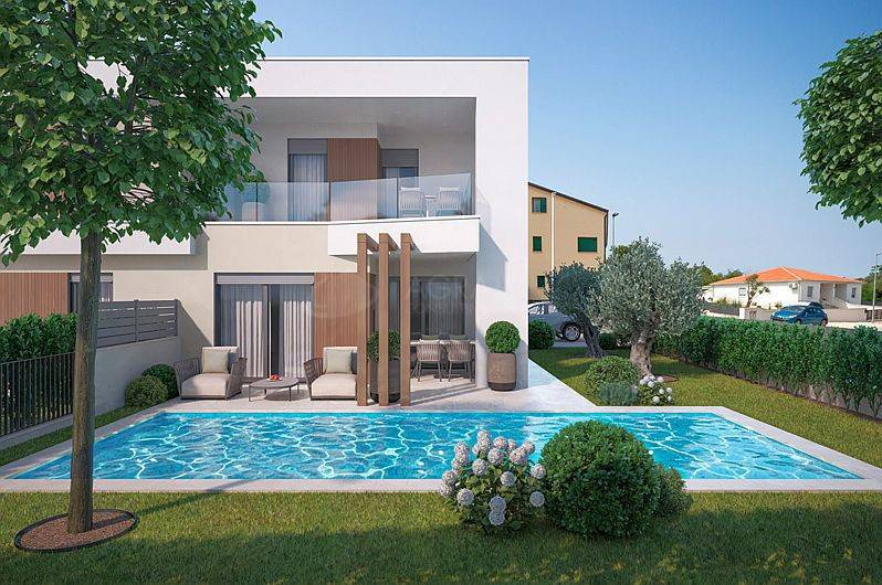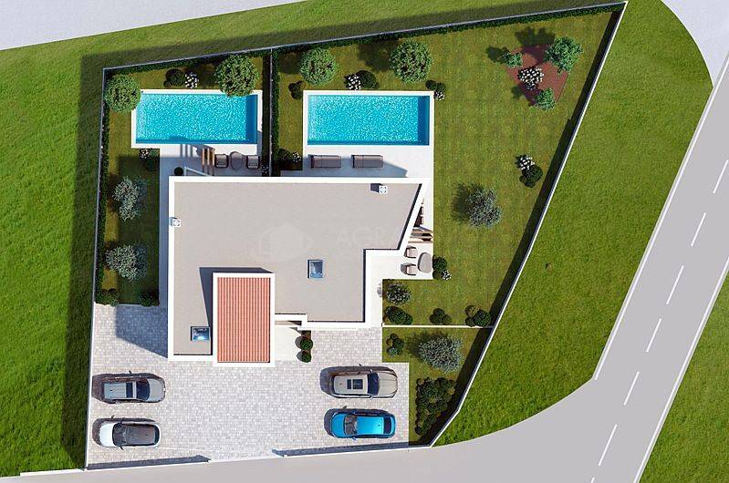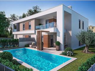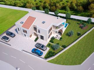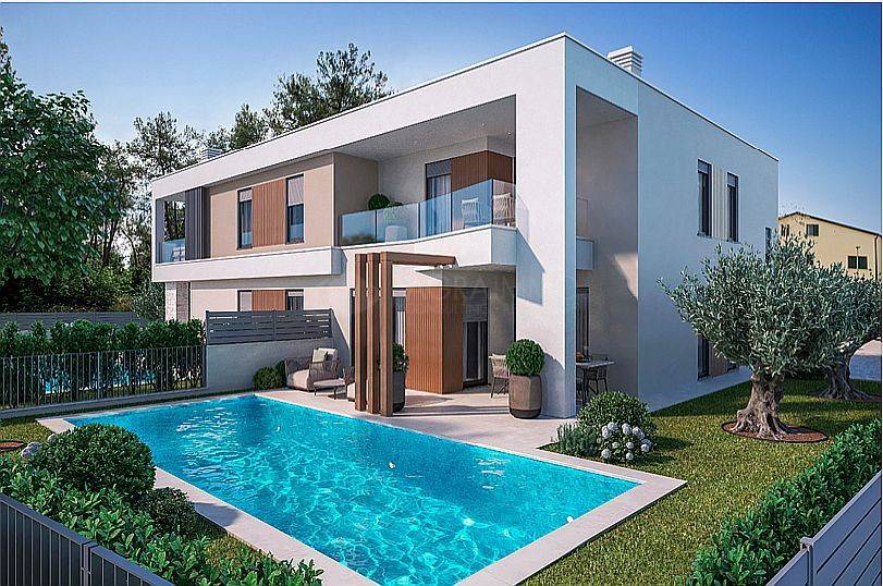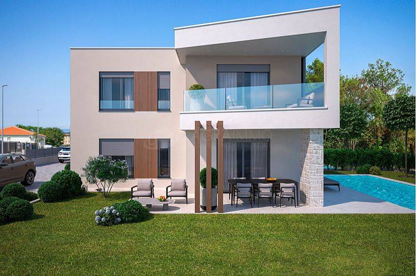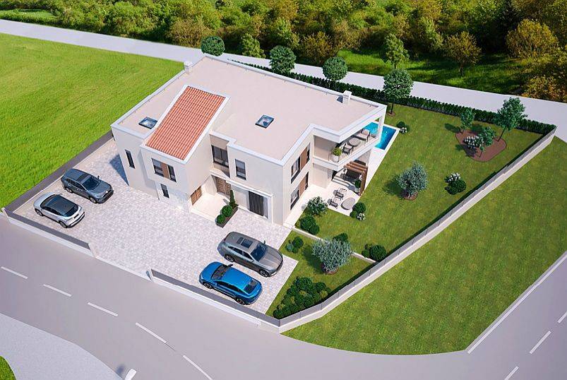 U blizini grada Umaga, na svega nekoliko minuta vožnje od mora, predivnih plaža Stela Maris i poznatih ATP teniskih terena, započinje gradnja ove očaravajuće vile s dvije stambene jedinice. Smještena u mirnom i ugodnom susjedstvu, ova nekretnina pruža savršen ambijent za odmor i opuštanje, a istovremeno je okružena vrhunskom gastronomijom, sportskim sadržajima i bogatom turističkom ponudom Istre. Prizemlje je osmišljeno tako da spaja funkcionalnost i udobnost: tu se nalazi prostran dnevni boravak povezan s moderno opremljenom kuhinjom i blagovaonicom, jedna spavaća soba pogodna za goste ili članove obitelji, kupaonica te velika terasa s bazenom i sunčalištem, idealna za boravak na otvorenom i uživanje u toplim danima. Na katu se smještaju dvije elegantne spavaće sobe. Master spavaća soba opremljena je velikom garderobom i izlazom na balkon, dok druga spavaća soba nudi jednaku udobnost i mir. Na katu se nalazi i prostrana kupaonica, a balkon pruža privatnost i nezaboravne trenutke u ljetnim večerima uz pogled na zalazak sunca. Posebnu vrijednost nekretnine daje brižno uređen vrt u kojem se smješta veliki bazen okružen sunčalištem te šarmantna ljetna kuhinja – savršeno mjesto za obiteljska druženja i gastronomske užitke. Kuća je projektirana u modernom stilu, s vrhunskom unutarnjom i vanjskom stolarijom, luksuzno opremljenim kupaonicama s prvoklasnom keramikom te klimatizacijom u svim prostorijama, što jamči udobnost i kvalitetu življenja tijekom cijele godine. Interijer je svijetao, prozračan i ugodan, a vlasnička dokumentacija uredna i spremna za prijenos. Lokacija dodatno osigurava praktičnost i atraktivnost: golf teren udaljen je 5 kilometara, teniski tereni i marina svega 2,5 kilometra, dok se renomirani restorani i vrhunska gastronomija nalaze na 500 do 1000 metara od vile. Ono što ovu nekretninu čini posebno zanimljivom jest činjenica da je idealna ne samo za vlastiti život i odmor, nego i za luksuzni turistički najam, pružajući zahtjevnoj i imućnijoj klijenteli ekskluzivnost, privatnost i vrhunski standard smještaja. Predviđena cijena odnosi se na jednu jedinicu ovog izuzetnog objekta u fazi „ključ u ruke“, a završetak radova planiran je za ljeto 2026. godine. Ova kuća u izgradnji predstavlja izvanrednu priliku za ulaganje u prestižan dom u Istri – bilo da tražite luksuzni privatni kutak za sebe i obitelj ili želite ostvariti sigurnu i dugoročnu investiciju kroz turističko iznajmljivanje. Slobodno nas kontaktirajte za dodatne informacije i dogovor oko obilaska ove jedinstvene nekretnine.