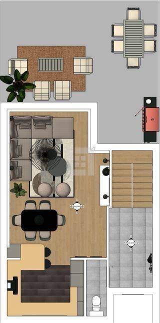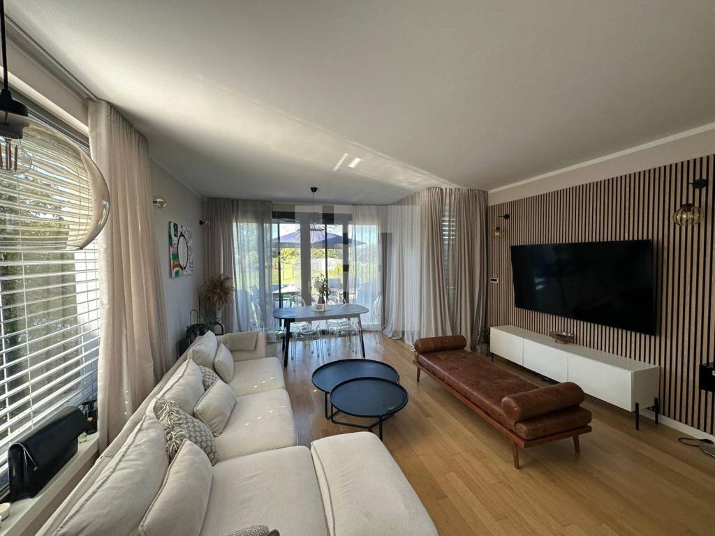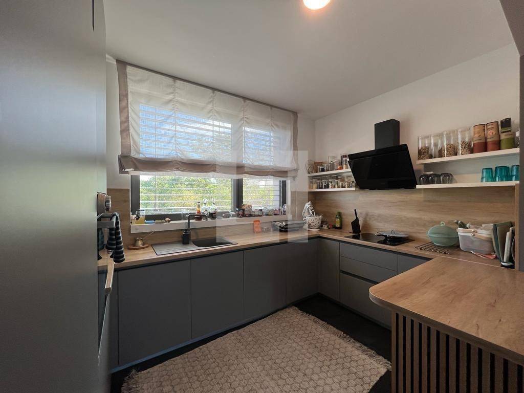 Prizemlje: Moderna kuhinja povezana sa svijetlim dnevnim boravkom s pristupom natkrivenoj i nenatkrivenoj terasi i privatnom vrtu od 350 m², plus praktičan gostinjski toalet.