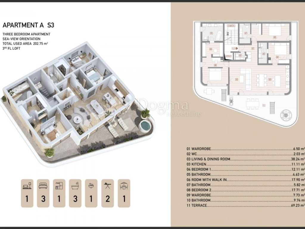 Ekskluzivni penthouse S3 u novogradnji O Residence centar Opatije s direktnim pogledom na more. Korisna površina: 149 m + 91 m rooftop terase = ukupno 240 m. Zgrada B, 3. kat (penthouse) s jacuzziem. Dio prestižnog projekta s 12 stanova u dvije zgrade. Useljivo 2026