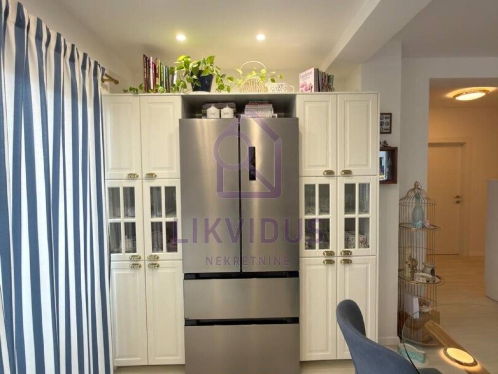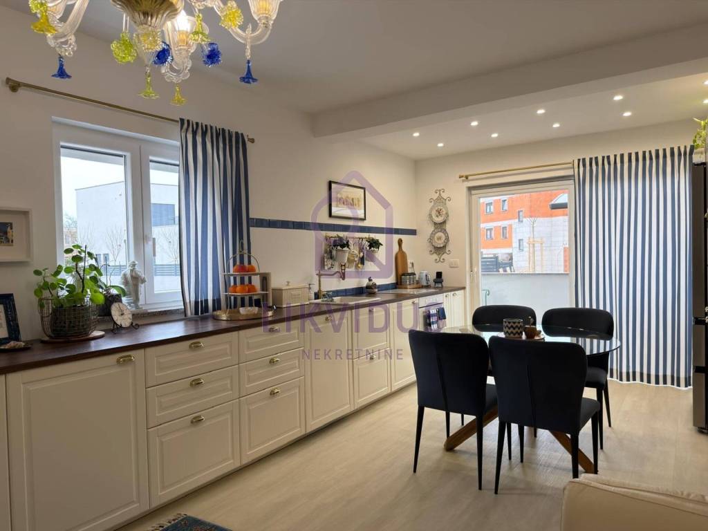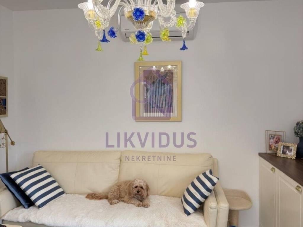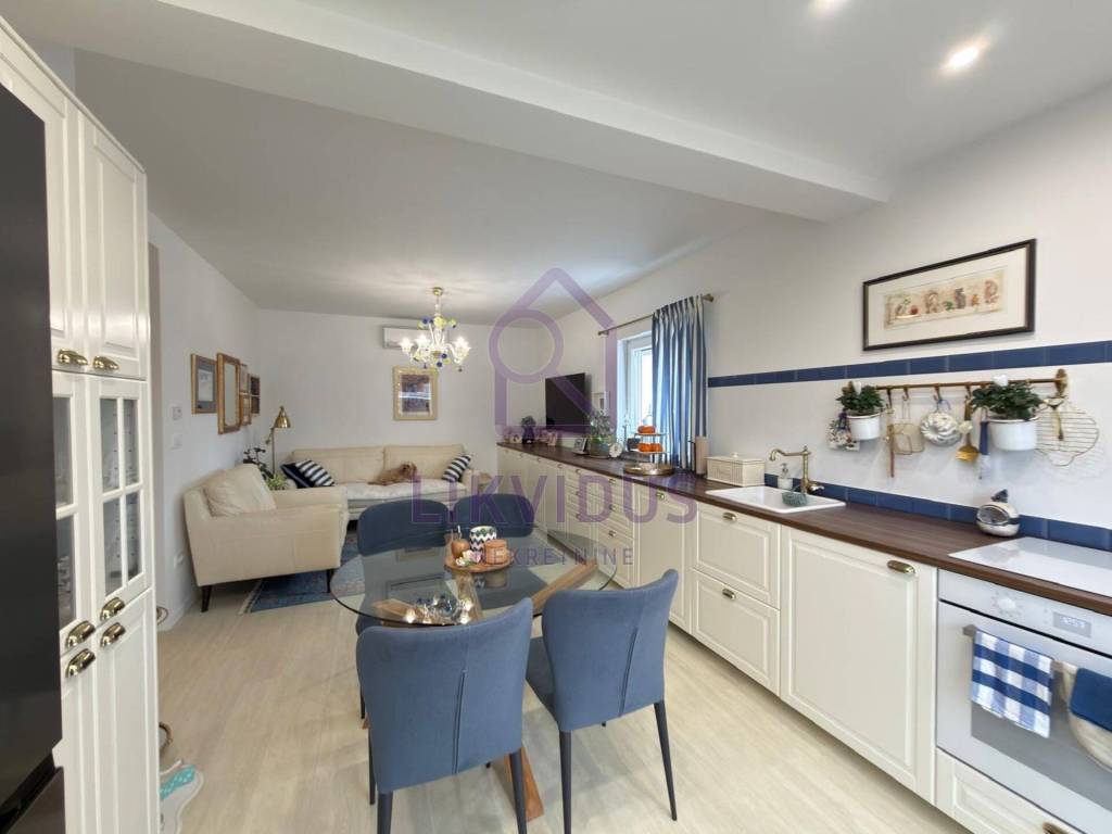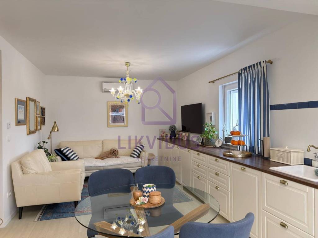 Stan se sastoji od dnevnog boravka, kuhinje i blagovaonice otvorenog koncepta, dvije udobne spavaće sobe, te moderne kupaonice. Srce doma je kuhinja izrađena po mjeri u "shabby chic" stilu, s mediteranskim naglascima. Prostor je iznimno svijetao, topao i pun karaktera. Retro slavina, keramički sudoper i tamnoplave pločice stvaraju zadivljujući kontrast, pružajući autentičan obalni ugođaj.
