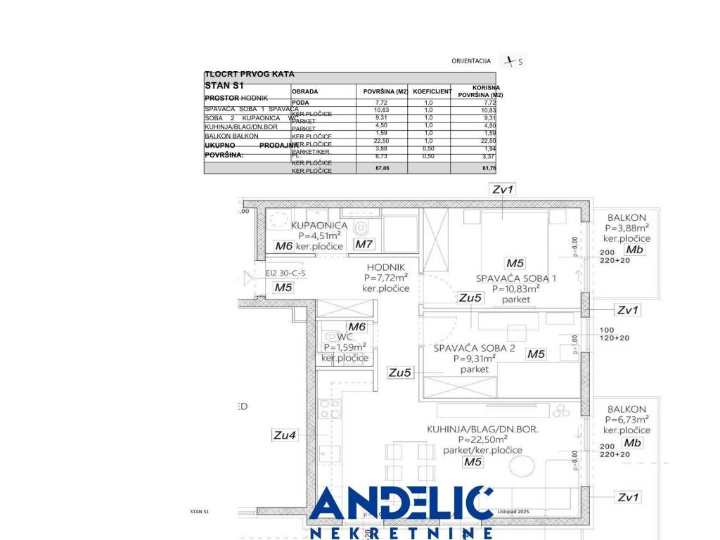 Stan S1 je dvosoban stan od 62 M2, lociran naprvom katu zgrade. Sastoji se od kuhinje i blagovaonice s dnevnim boravkom, hodnika, kupaonice, wc-a, ostave idvije sobe. Stan imadva balkona površine 10,61 m2.Orijentiran je premaistoku i jugu.