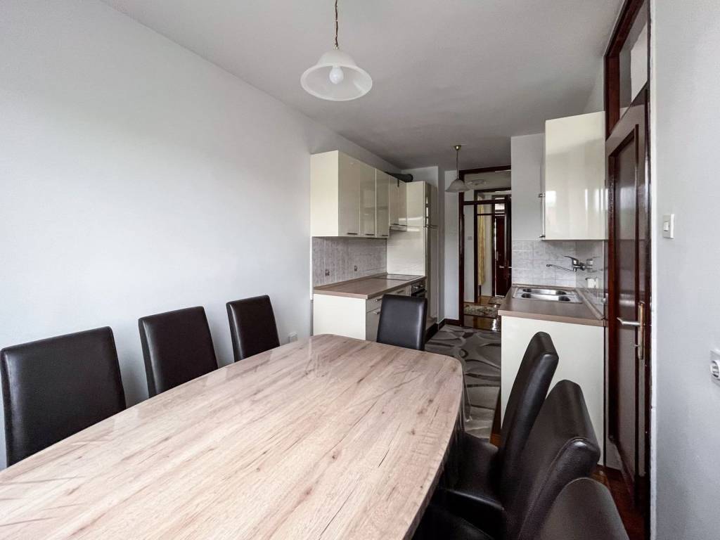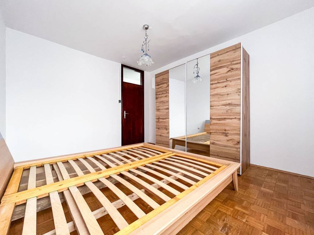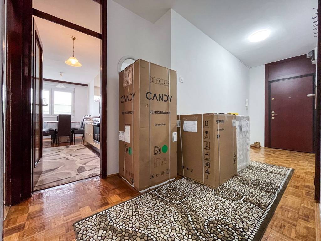 Stan je namješten i opremljen: kauč na razvlačenje, ormari, bračni krevet 180x200 u jednoj spavaćoj sobi, klima uređaj, stolić, blagovaonski stol, stolice, kada, toalet, PVC stolarija, protuprovalna vrata, portafon i sl. NOVA PERILICA POSUĐA, PERILICA RUBLJA I HLADNJAK! Stan ima mnogo spremišnog prostora - ormari, ormarići, hodnik sa nišom za stvari, ostava i vlastito spremište u podrumu.