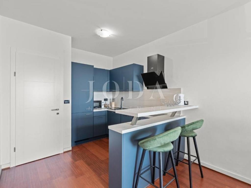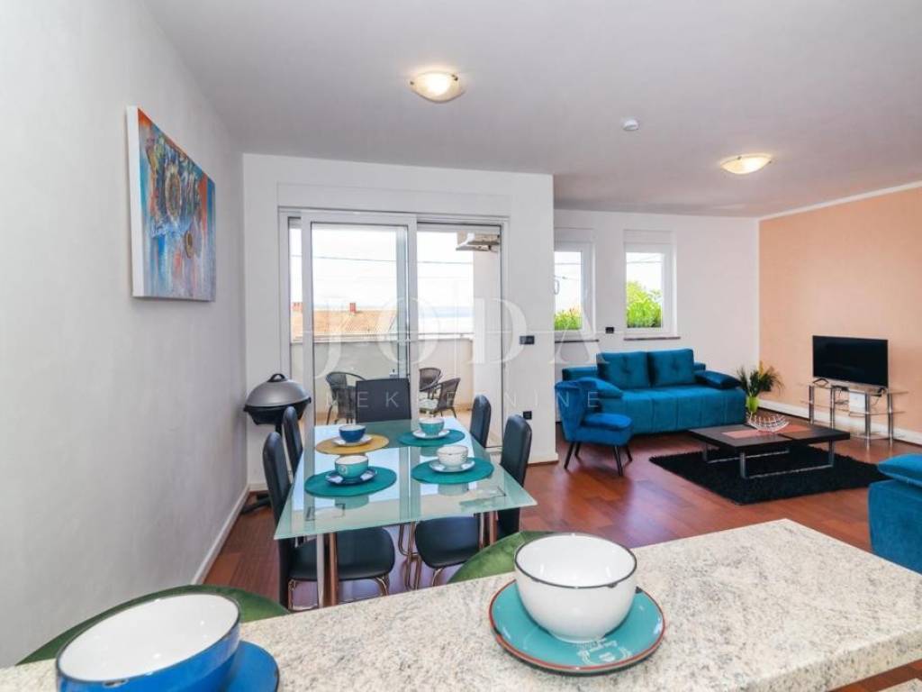Apartman ima ukupnu stambenu površinu od 72 m, a sastoji se od prostranog dnevnog boravka s kuhinjom i blagovaonicom, dvije spavaće sobe te kupaonice. Iz dnevnog boravka izlazi se na balkon s pogledom na more, idealan za opuštanje i uživanje u mediteranskom okruženju.